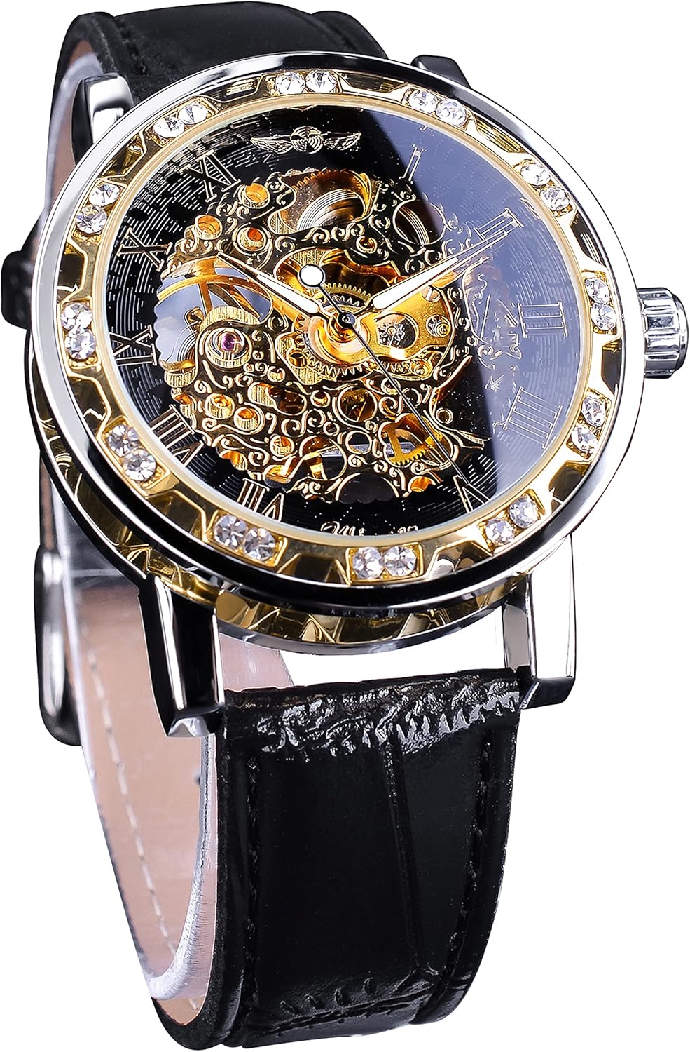 Reloj de esqueleto mecánico manual retro ganador con diamante y flor tallada artesanal Reloj de esqueleto mecánico clásico con números romanos