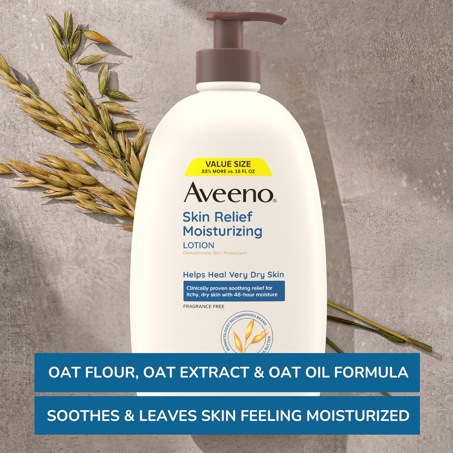 Loción para piel muy seca: La loción hidratante Aveeno Skin Relief de 33 fl. oz. proporciona hidratación durante 72 horas* y alivio calmante para piel muy seca y con picazón; con triple avena, manteca de karité y dimethicone; fórmula sin fragancia y no grasa