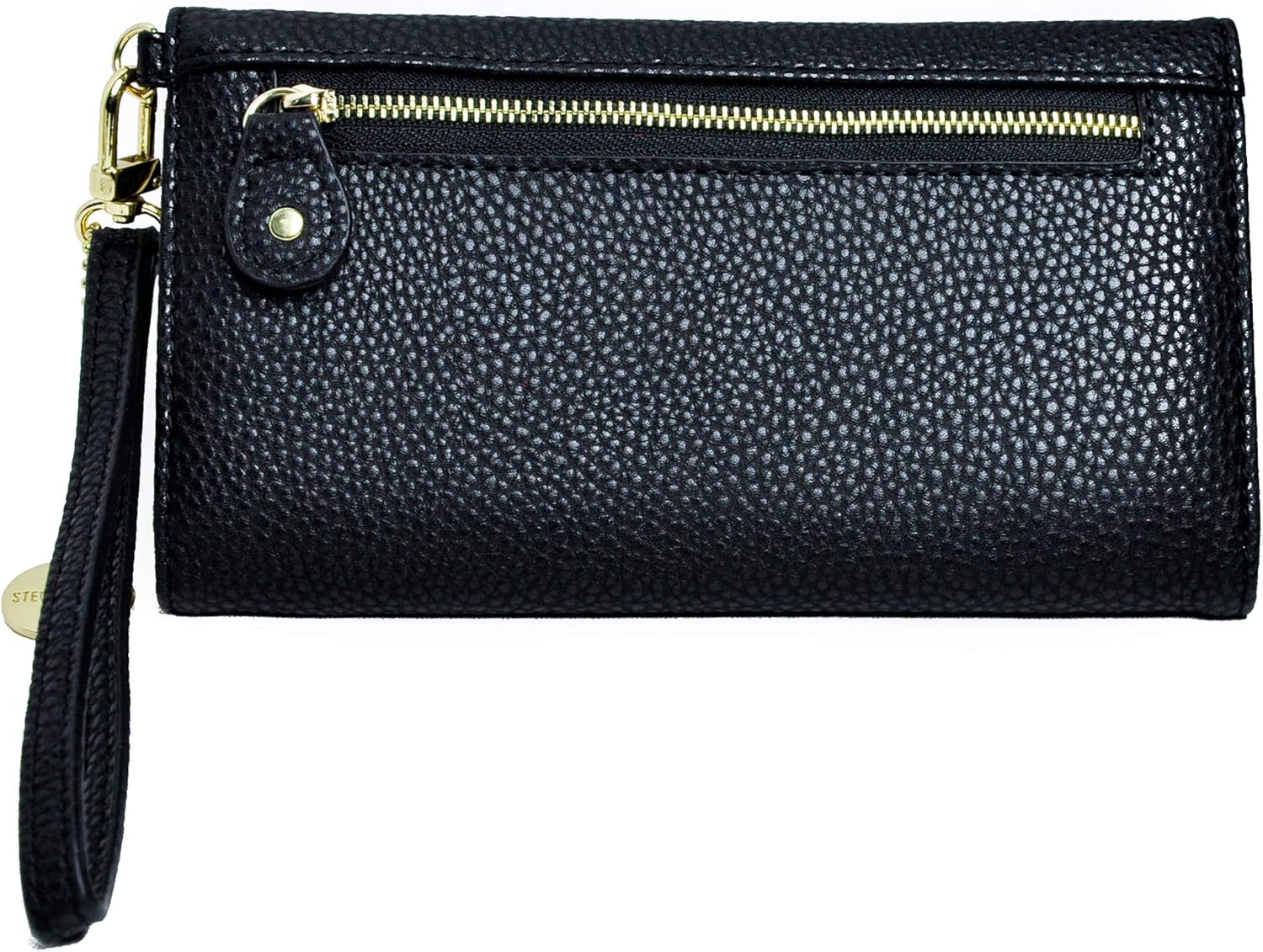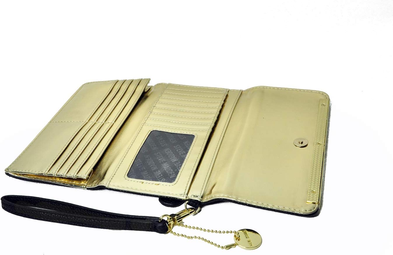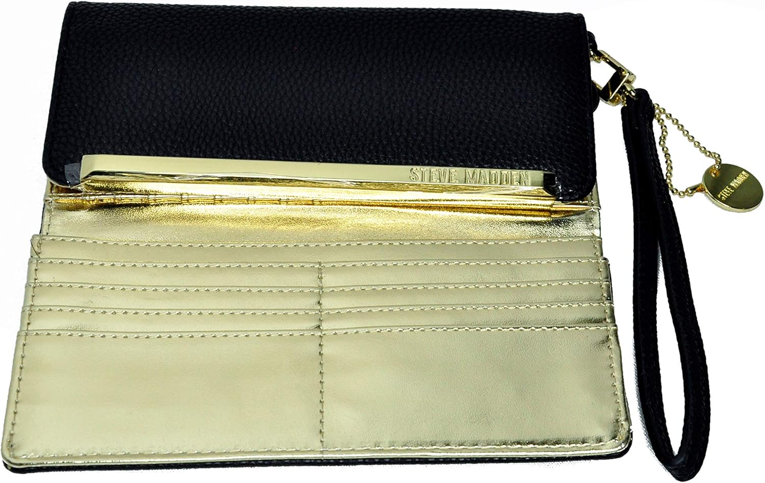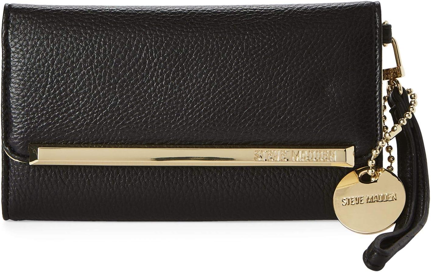 Keep your style and organization in check with the Steve Madden® Trifold Wallet. Made of 100% PU. Wristlet carry handle. Tri-fold design with a snap closure. Exterior includes brand logo hardware with zipper pocket. Interior offers two slip pockets with and sixteen credit card slots. Imported. Measurements: Bottom Width: 7 3⁄4 in Depth: 1 in Height: 4 2⁄5 in Strap Length: 12 1⁄2 in Strap Drop: 5 in Weight: 8.6 oz