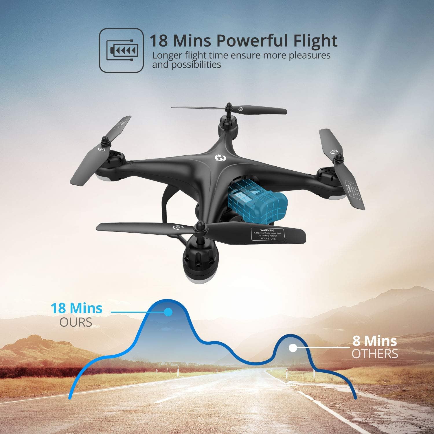 39 minutos de vuelo: incluye 3 baterías Li-Po modulares que proporcionan hasta 39 minutos de vuelo. Un mayor tiempo de vuelo te permite disfrutar de todas las excelentes características de este dron. La batería HS430 tiene un chip incorporado para la protección contra sobretensiones. Y hay más... El mando a distancia emite un sonido de advertencia cuando la batería está baja. ¡No tienes que preocuparte por perder tu dron!