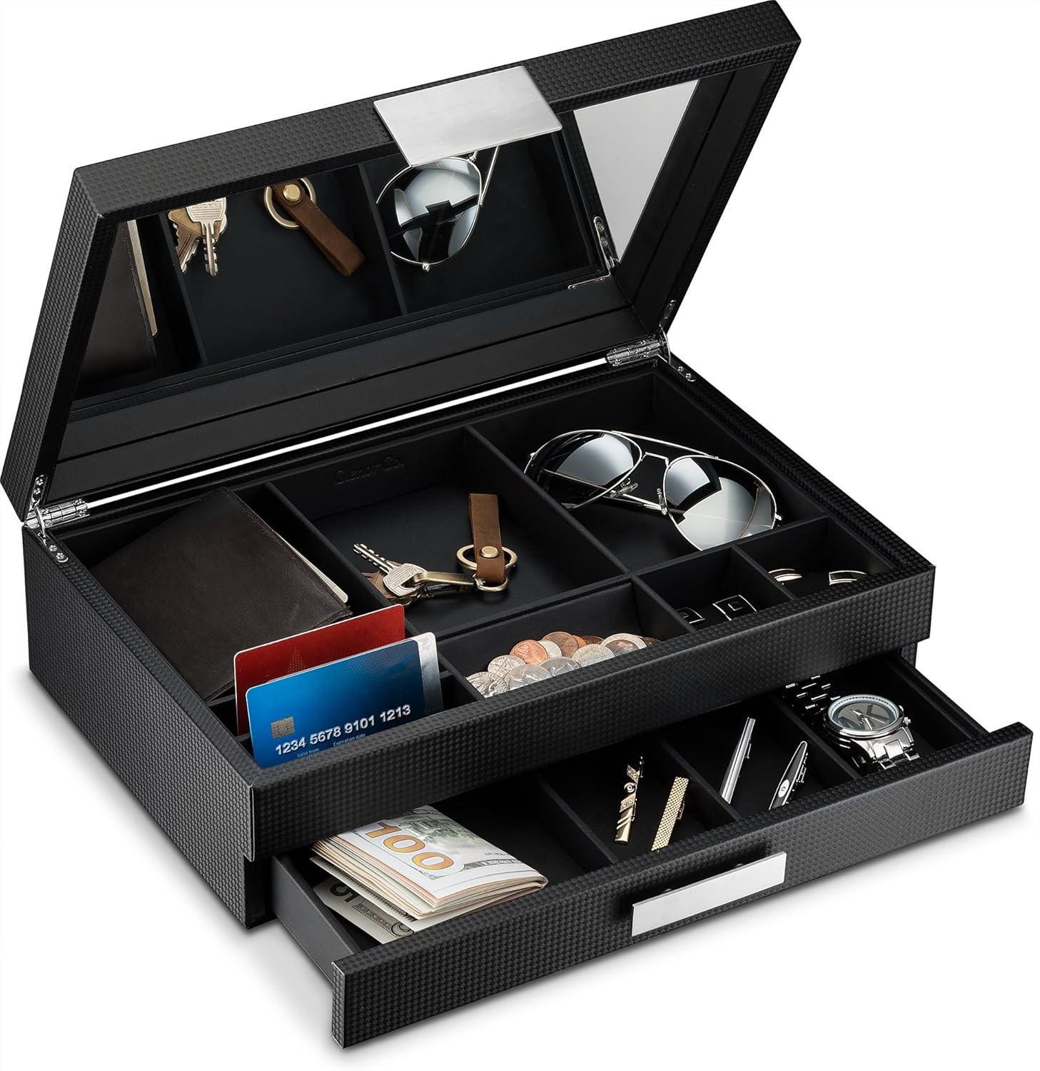 Mens Valet/Dresser Organizer - Luxury 12 Slot Jewelry Accessories Box, Carbon Fiber Design, Drawer Tray, Metal Buckle & Large Mirror for Men’s Watches, Sunglasses, Wallet - Pu Leather Black
