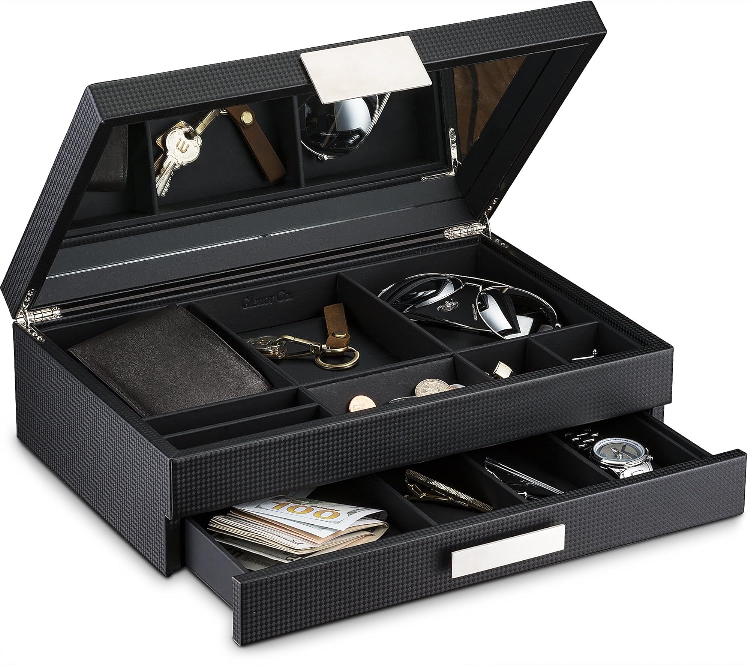 STAY ORGANIZED - Keep your dresser organized and your daily pocket valuables in order in your Glenor Co Valet Jewelry Box. This box has compartments of various sizes and shapes to keep all types of accessories separate, organized and all in one place for easy access. These compartments will hold your wallet, sunglasses, watches credit cards, cufflinks, rings, change ,pens, chains and even your passport and cell phone. Save critical time and turn your frantic frustrated mornings into a breez