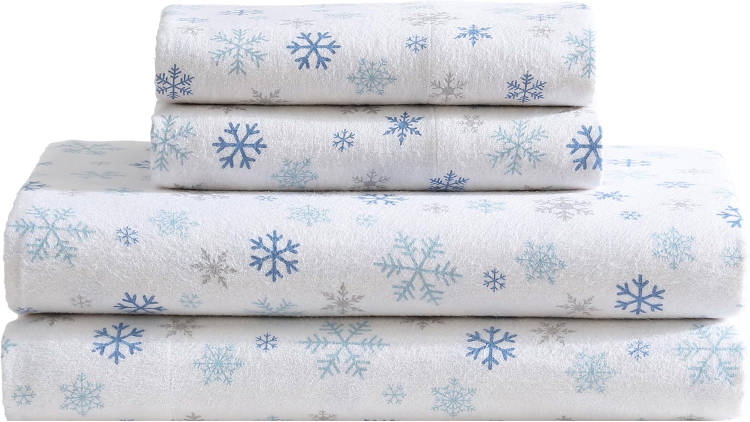 Beatrice Home Fashions 4-Piece Winter Holiday Flannel Sheet Set, Soft, Cozy, 100% Cotton, 15-inch Deep Pockets, Full, Fresh Snow Dusty Blue