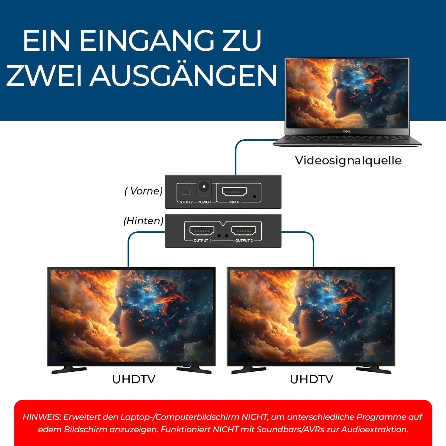 ULTRA HD 1 X 2 HDMI Splitter : Perfect for Duplicating 1 HDMI Input Signal to 2 Monitors or 4K Display Screens, HDMI Splitter 1 in 2 out. The device comes with a dual voltage supply using a US plug, and an adapter/converter is provided for international use.