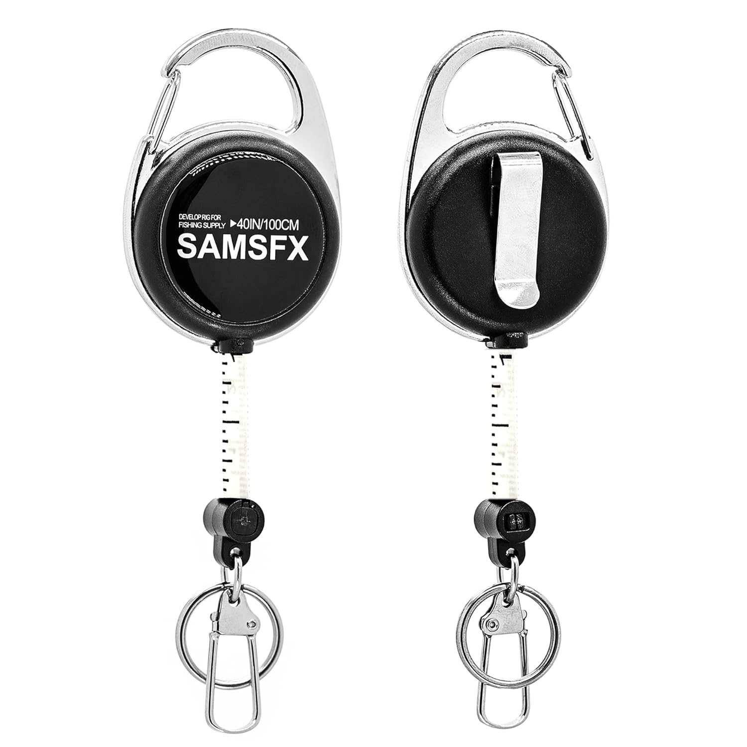 SAMSFX FISHING MAKING YOUR FISHING SIMPLE & EFFICIENT SAMSFX carabiner tape measures tool works as zinger and great to help back your fish tales with some hard proof Pay Attention: Please allow 0.4-0.8 " (1-2 cm) differences due to manual measurement Due to the difference between different monitors, the picture may ot reflect the actual color of the item Features: The zinger itself also functions as a measuring tape made from a high quality waterproof polyester material The zinger retractors keep the items you need in easy reach allowing for efficient fishing The inside flexible vinyl tape measure is 1M/40In in length, which totally meet your requirements for measure stuff There is Inch calibration clearly printed on one side, and Centimeter calibration on the other side, both for your convenient. The scales are definitely accurate Fastening to a jacket or top, they have a retractable cord and clip which is perfect for holding forceps, line clippers, floatant or any other small fishing tools, regularly used item You can also put it in purse or pocket, the plastic tape is small and won’t occupy any space, portable, easy to carry & storage The tape measure is widely used in daily life. It can be used to measure fish, tools ,hooks, clothes and your body measures etc. Tailors use it too