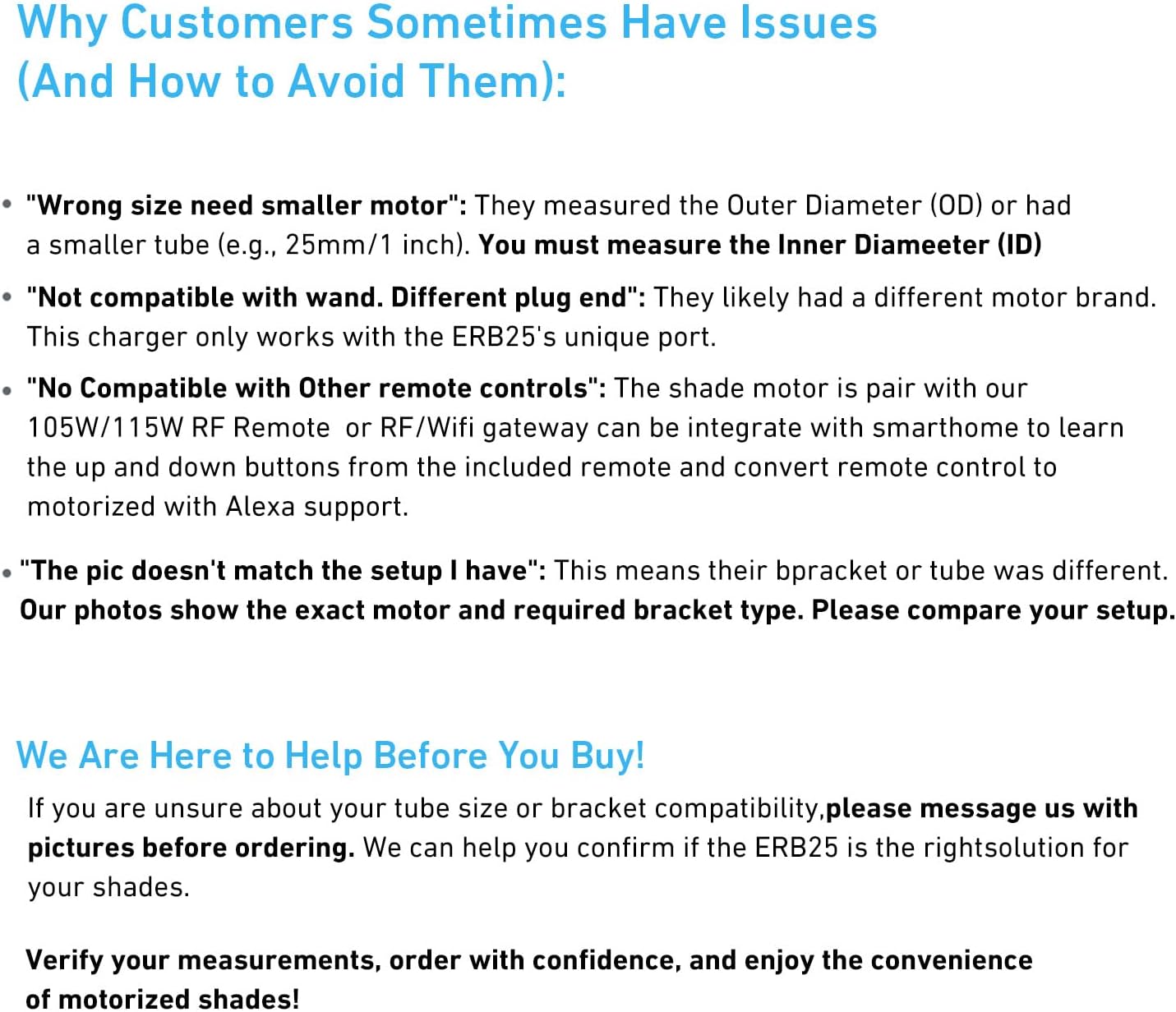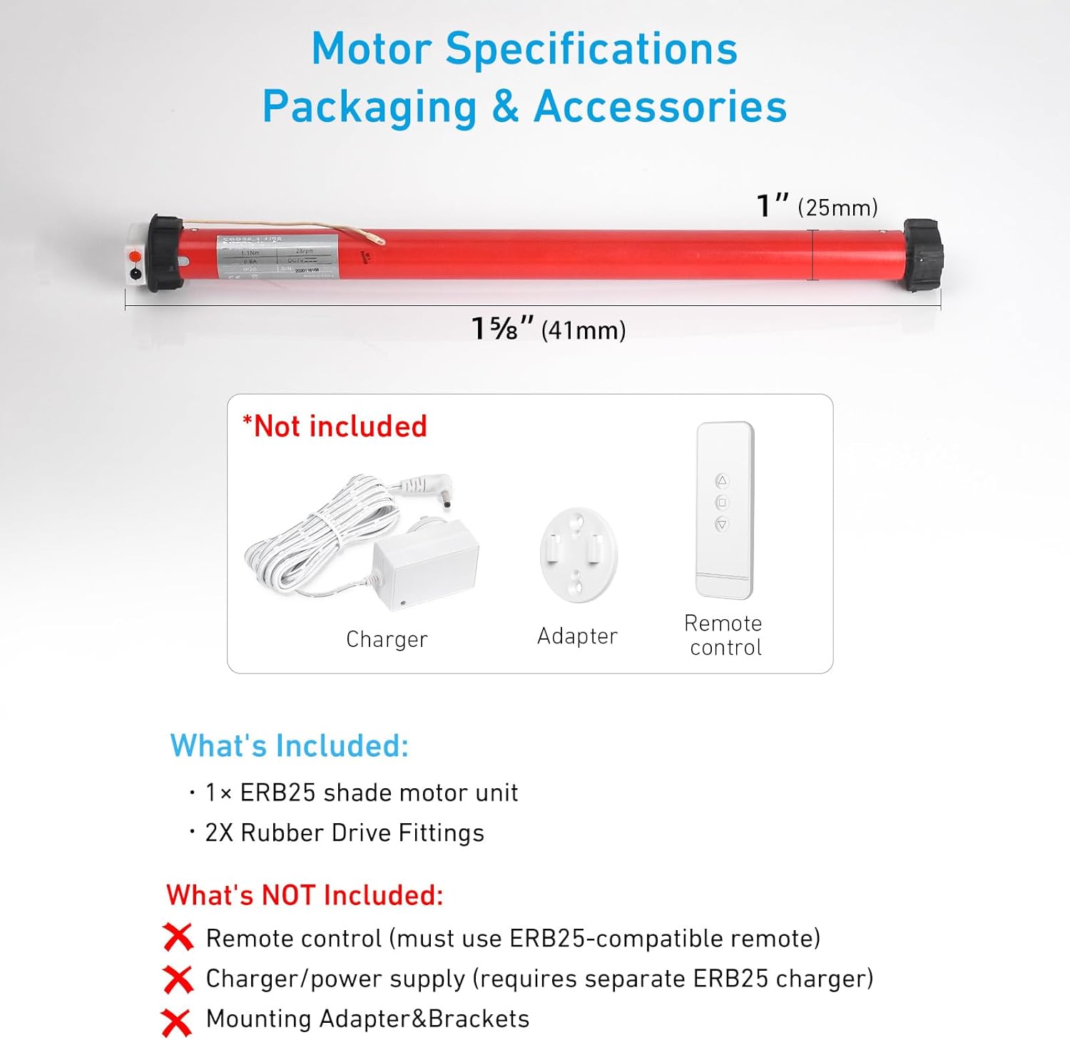 What's Included: 1× ERB25 shade motor unit, 1x 1.5in/38mm Rubber Drive Fittings. PLEASE NOTE: 1. This is JUST THE MOTOR - No remote/charger/power supply included 2. Requires ERB25-compatible remote (will not pair with other systems) 3. Needs separate ERB25 charger (not USB-chargeable)