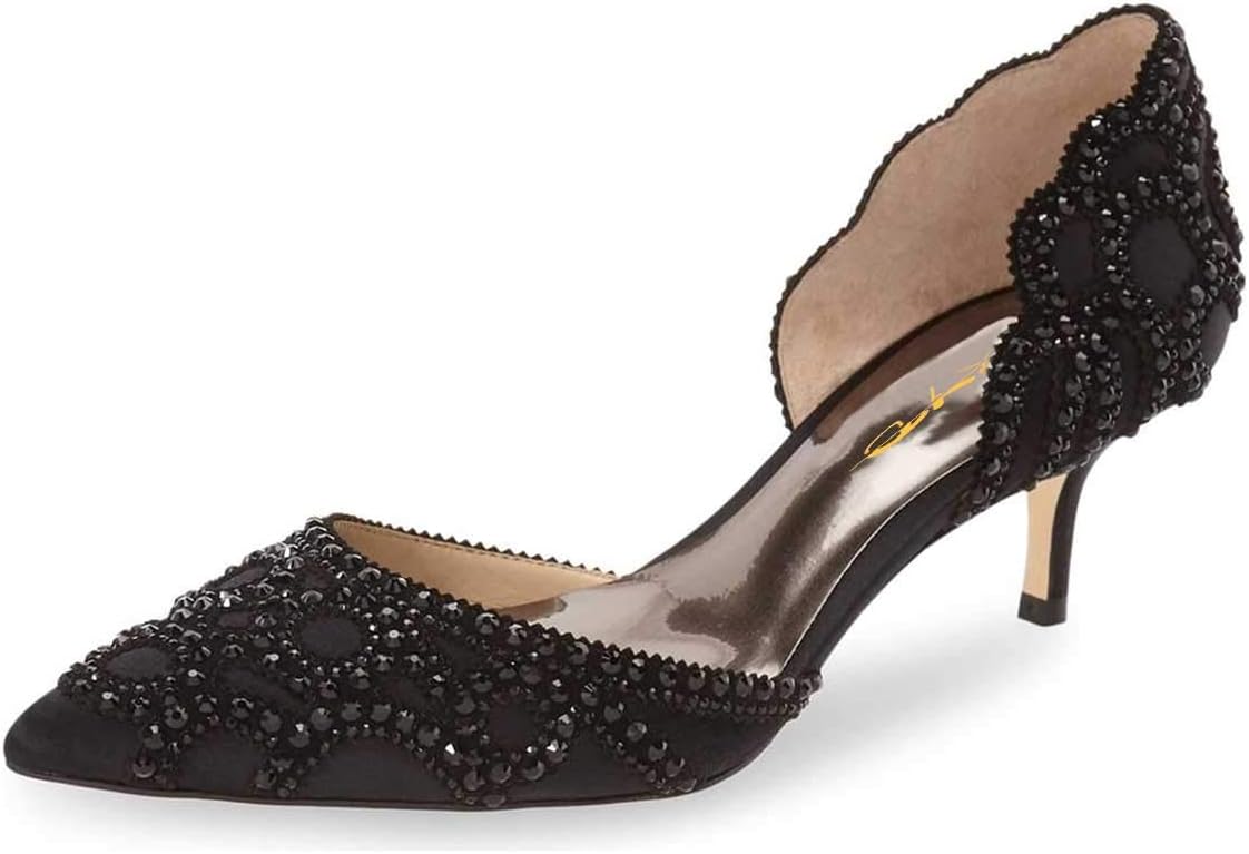 XYD Women's Pumps, Elegant Pointed Toe, D'Orsay Kitten Low Heels, Rhinestone Studs, Slip-On Satin Shoes for Wedding