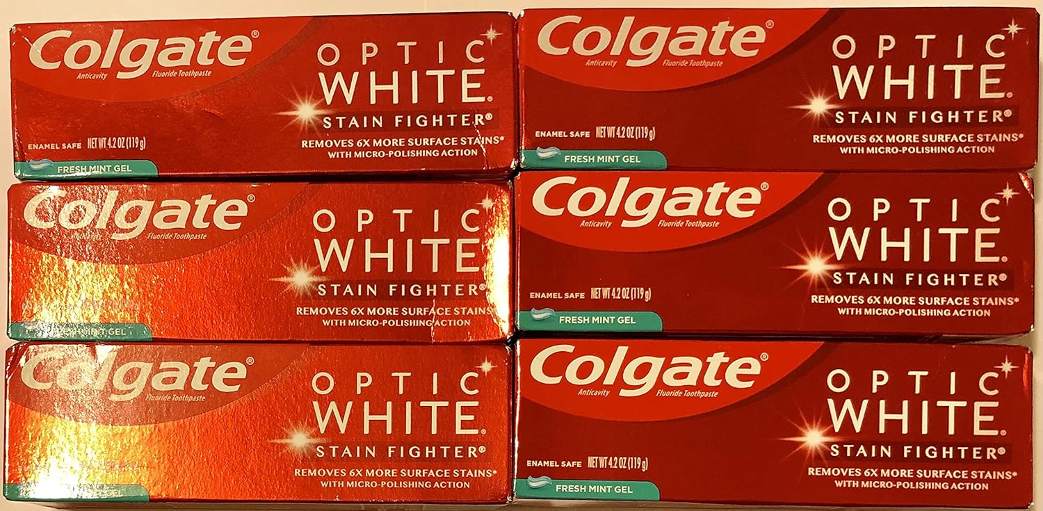Colgate Optic White Toothpaste - Stain Fighter - Fresh Mint Gel - Net Wt. 4.2 OZ (119 g) Per Tube - Pack of 6 Tubes