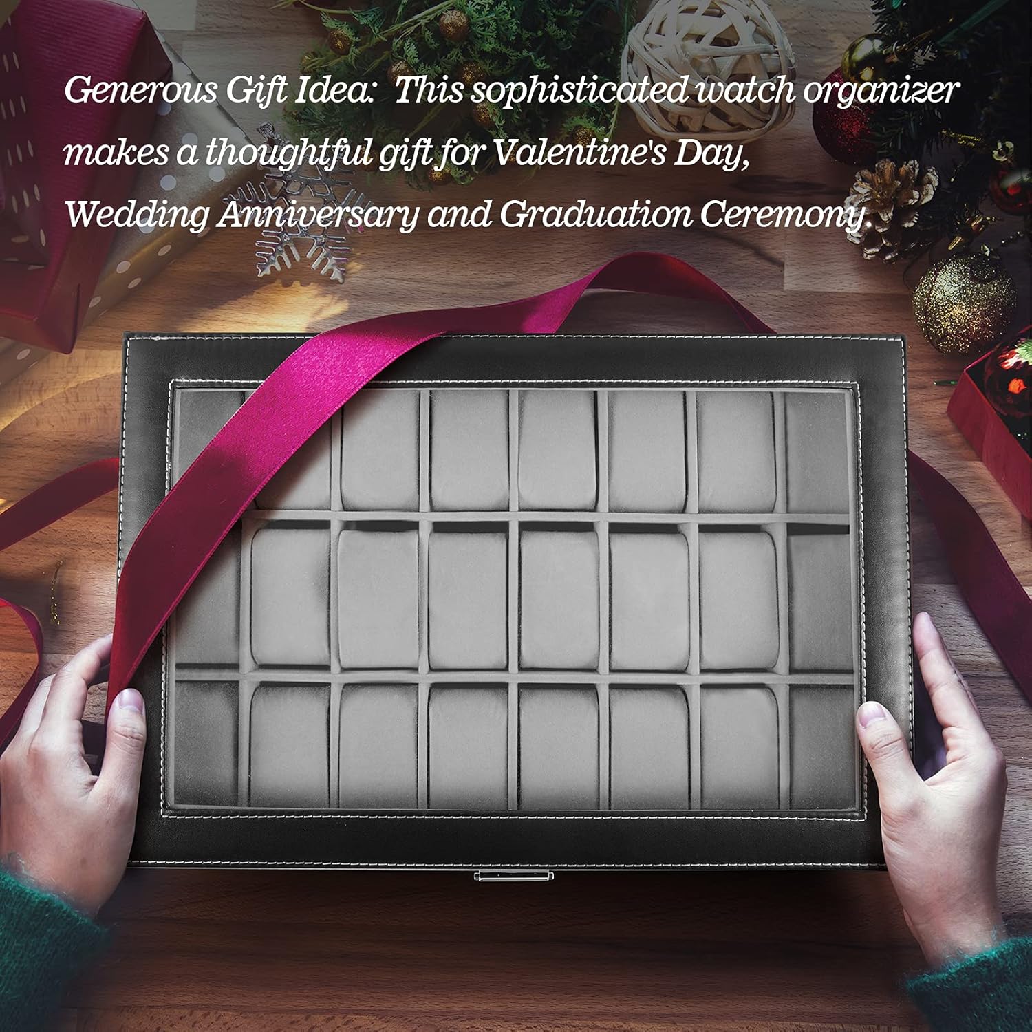 Watch Box, 24 Slots Mens Watch Organizer Lockable Jewelry Display Case with Large Acrylic Lid Black Faux Leather