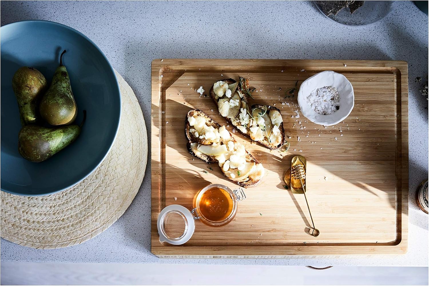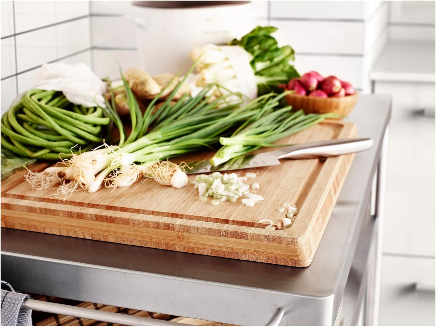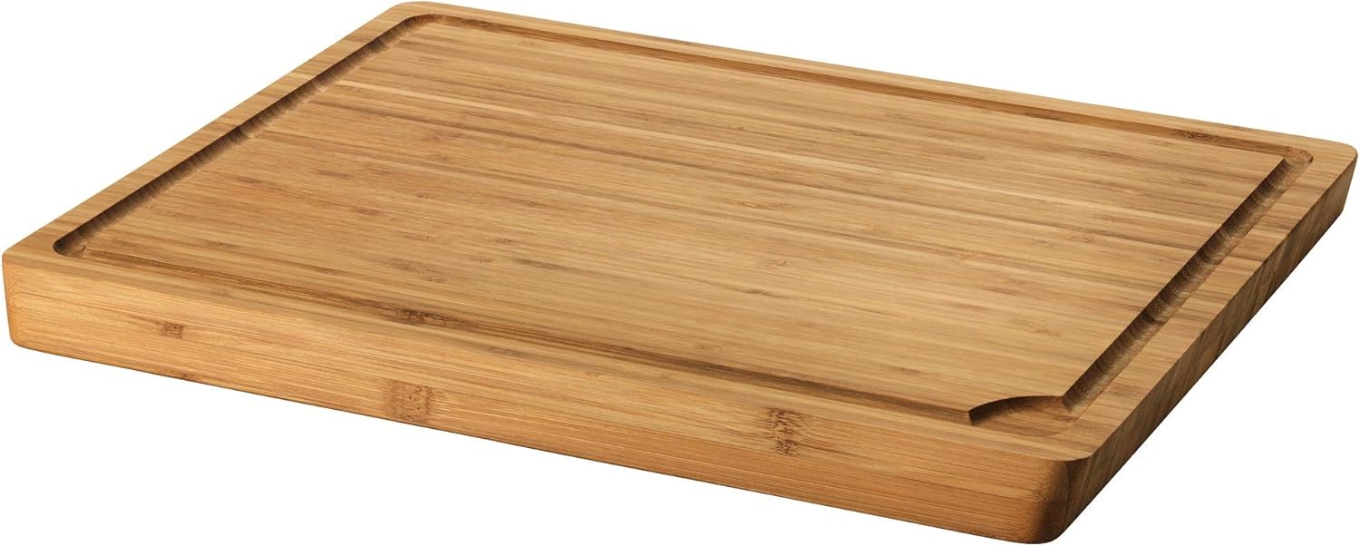 The chopping board collects food juice in the milled groove and prevents it from spilling on to your countertop. You can easily turn the chopping board and use both sides when you prepare food, because it has easy-to-grip slanted edges. Can be placed over the bowl on BOHOLMEN, BREDSKÄR or FYNDIG sink to get an extra work surface for preparing food. Made of bamboo, which is an easy-care, durable natural material that is also gentle on your knives. The weight provides a stable base for cutting. Good to know Fits in the bowl of all sinks in the BOHOLMEN series. SKYDD wood treatment oil for indoor use is recommended for maintenance. Care instructions Should be treated with food approved oil now and then. Handwash only.