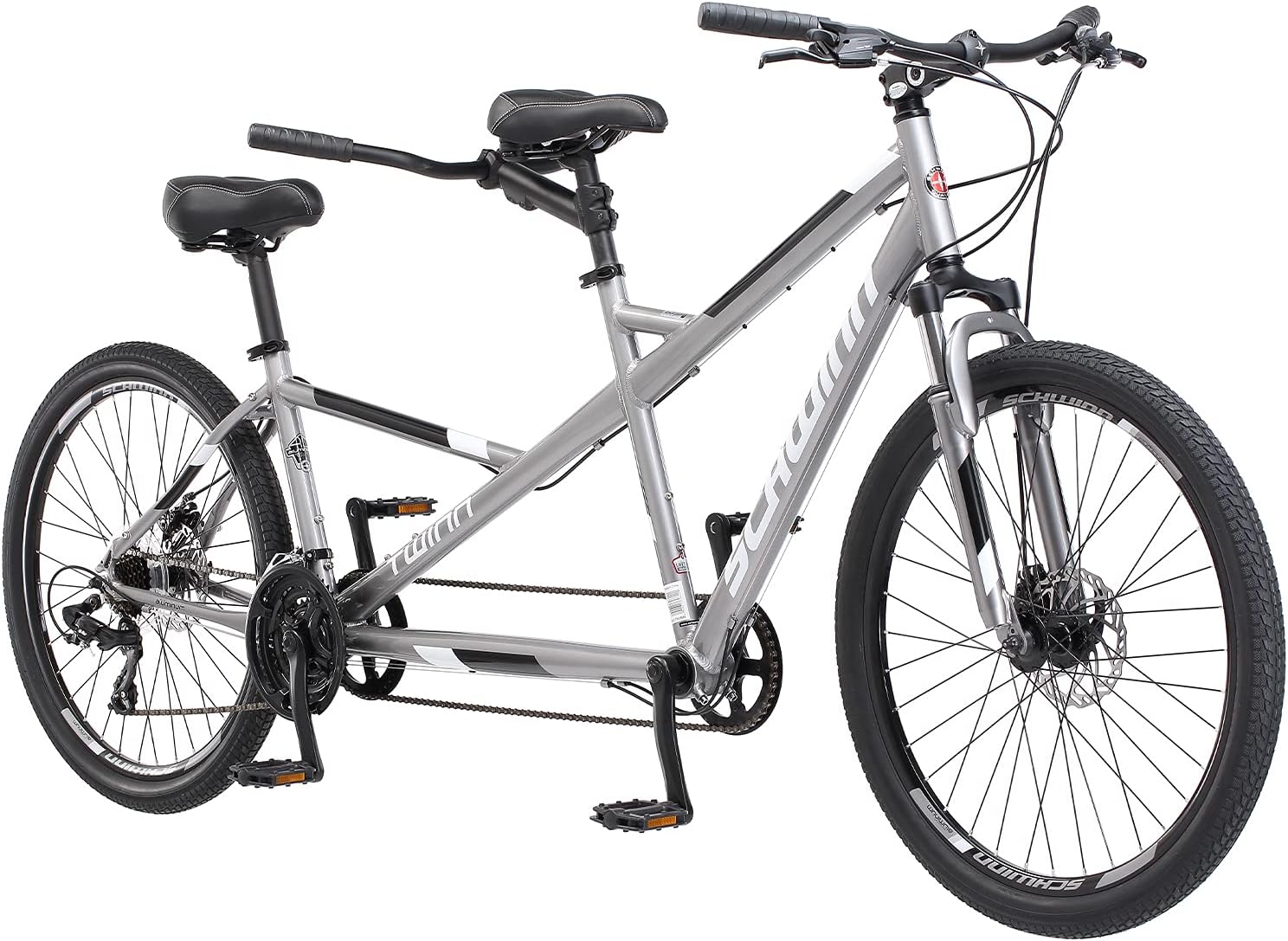 Enjoy the ride with the Schwinn Twinn Classic Adult Tandem Bike, a two seater bike that brings another rider along. Designed for leisurely adventures, this bike for adults looks as good as it feels. With two seats at different heights, it accommodates a variety of riders, and the super low step-through frame in the rear allows for a smaller passenger. The 21-speed trigger shifters, rear derailleurs, and front and rear mechanical disc brakes ensure smooth and reliable handling, and the plush fitness seat and ergonomic grips add lasting comfort. With 26-inch wheels, this tandem bike fits a front captain from 5'11" - 6'2", a rear stoker from 5'3" - 5'10", and is perfect for cruising the neighborhood, bike paths, or beach. Assembly is easy with a few common household tools and the included instruction guide. Comes with a limited lifetime warranty for as long as you own the bike. At Schwinn, we're empowering millions to enjoy the joy and freedom of riding.