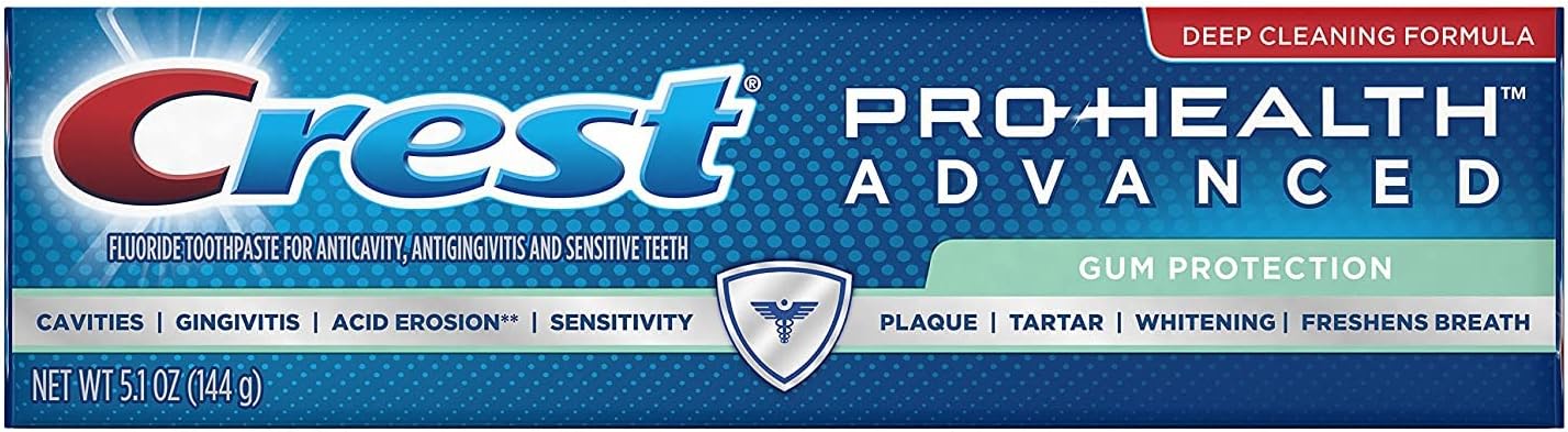 Crest Pro-Health Advanced Gum Protection Toothpaste, 5.1 oz (Pack of 2) - Starting from Day 1, Advance to Healthier Gums and Stronger Teeth* with Crest Pro-Health Advanced Gum Protection. This toothpaste contains ActivClean Crystals for stain prevention. It also provides Crest's highest level of protection against plaque bacteria to keep gums healthy and provide longer-lasting freshness**. It is made with patented stannous fluoride and provides clinically proven protection. It provides 8 advanced benefits in 1, including: Fresh Breath and Whitening + Protection against Acid Erosion, Sensitivity, Cavities, Gingivitis, Sensitivity, Plaque, and Tartar. *vs. ordinary toothpaste with continued use. Starts fighting plaque and protecting enamel from Day 1. ** vs Crest Pro-Health toothpaste. Acid Erosion Effects: Acids in everyday food can soften & thin enamel, leaving teeth less white, weaker, and sensitive. Provides Crest Pro-Health Advanced Toothpaste's highest level of protection against plaque bacteria to keep gums healthy. Deep cleaning formula. From the inventors of Patented Stannous Fluoride. Directions: Adults and children 12 yrs. & older: apply at least a 1-inch strip of the product onto a soft bristle toothbrush. Brush teeth thoroughly for at least 1 minute twice a day (morning and evening) or as recommended by a dentist. Make sure to brush all sensitive areas of the teeth. Don't swallow. Children under 12 yrs.: ask a dentist.