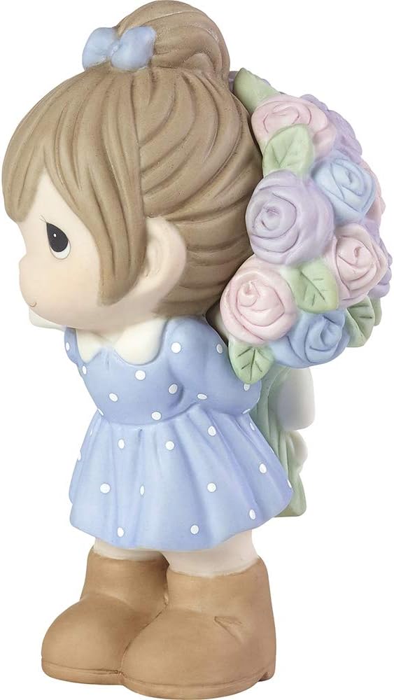 This cute Mother’s Day figurine features a sweet girl holding a rose bouquet behind her back. The bouquet is too big to hide, just like her love for her mom. She’s wearing adorable boots, a polka dot dress, and a simply beautiful smile. Your mom will know just how much you love her when she sees this lovely surprise. It’s like a floral gift that lasts for years. Makes a great Mother’s Day, birthday, or ‘just because’ gift from a daughter to her mom. Adds an adorable touch of heartwarming love to collections, tabletops, and nightstands. Meticulously hand-sculpted in fine bisque porcelain and expertly hand-painted. Approximately 5 inches high.