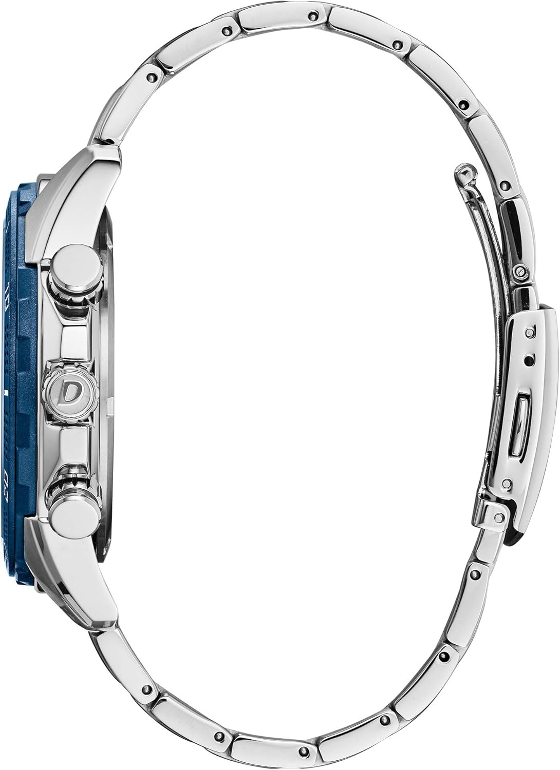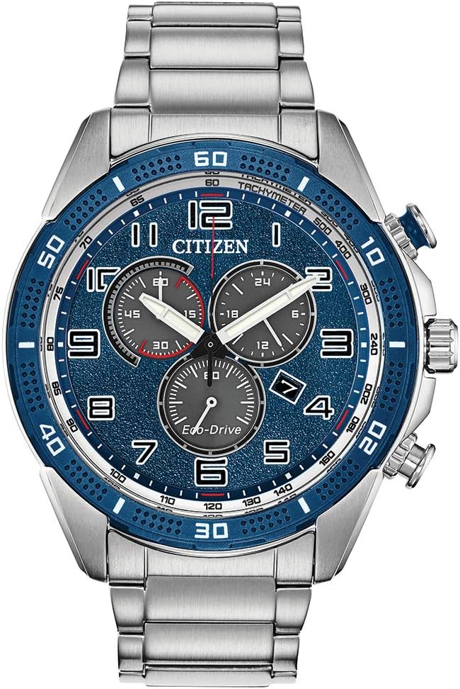 Reloj Eco Drive para hombre con fecha del mes (no perpetua) y cronógrafo de 60 minutos, caja de acero inoxidable con bisel de cerámica tono azul, cristal de cristal mineral, corona chapada en plata de tono amarillo, botones de acero inoxidable, fondo de la caja atornillado de acero inoxidable (poco espacio para grabado), brazalete de acero inoxidable con cierre de presión, esfera tono azul oscuro, manecillas de hora y minutos tono blanco con luminosidad, manillar de cronógrafo tono rojo y negro (sin luminosidad), subdiales tono negro, manillar verdadero tono oro blanco (6:00, sin luminosidad), manecillas de cronógrafo de 24 horas y 60 minutos tono oro blanco (sin luminosidad), índices de hora aplicados tono blanco con luminosidad