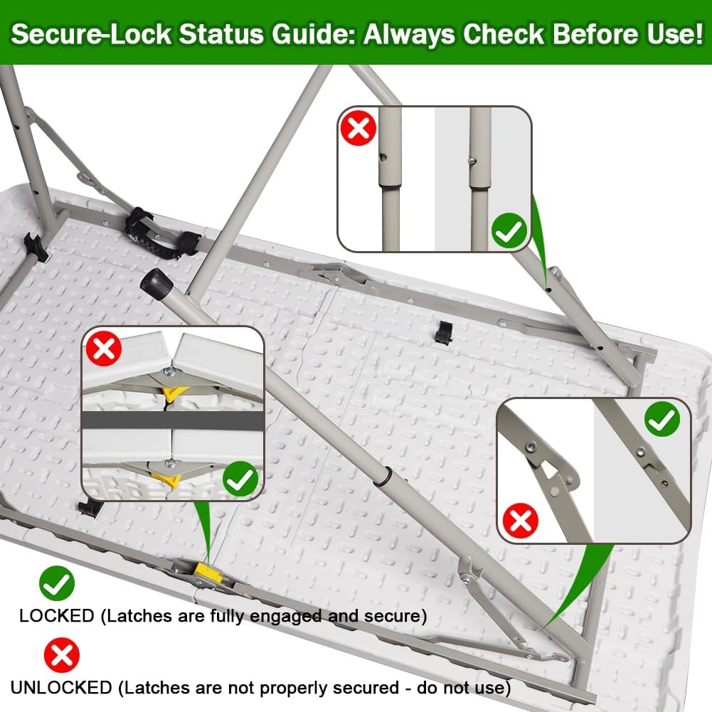 Quick Setup & Three Accurate Height Settings: Ready to use in seconds—no assembly needed. Features three precise height options: 18.9″ (48 cm), 24″ (61 cm), and 29.1″ (74 cm). Adjust evenly by lifting the tabletop until the mechanism fully engages. Always verify lock is engaged: LOCKED