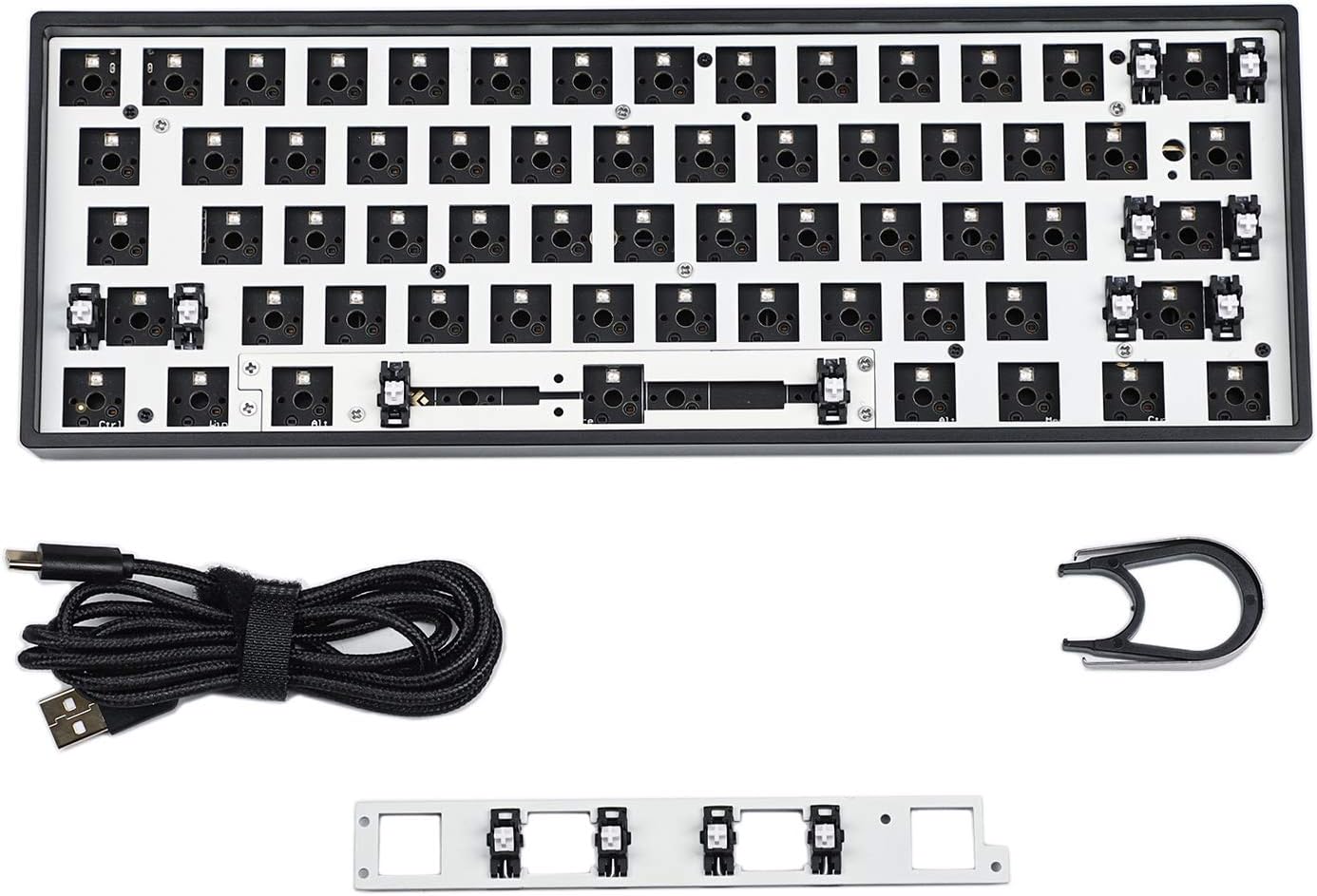 El paquete incluye funda, pies, tornillos, PCB de intercambio en caliente GK61, placa de plata de aluminio, cable USB, herramienta de extracción de interruptor. La funda de teclado de aluminio está hecha de aluminio CNC Sand Blast y luego anodizada. La funda de plástico está moldeada en ABS. El chipset es MCU 32 bits, 8M Flash, 3 unidades 256* 256* 256 RGB para admitir 16,8 millones de RGB. PCB tiene RGB presoldado, está por debajo de cada interruptor. PCB RGB puede soportar música. No hay interruptores en el kit, puedes pedir tú mismo los interruptores Cherry Gateron Kailh SMD Box, etc. Solo tienes que poner los interruptores, no es necesario volver a soldar. PCB es programable con el software GK6x Plus, se puede descargar en el sitio oficial jikedingzhi punto com