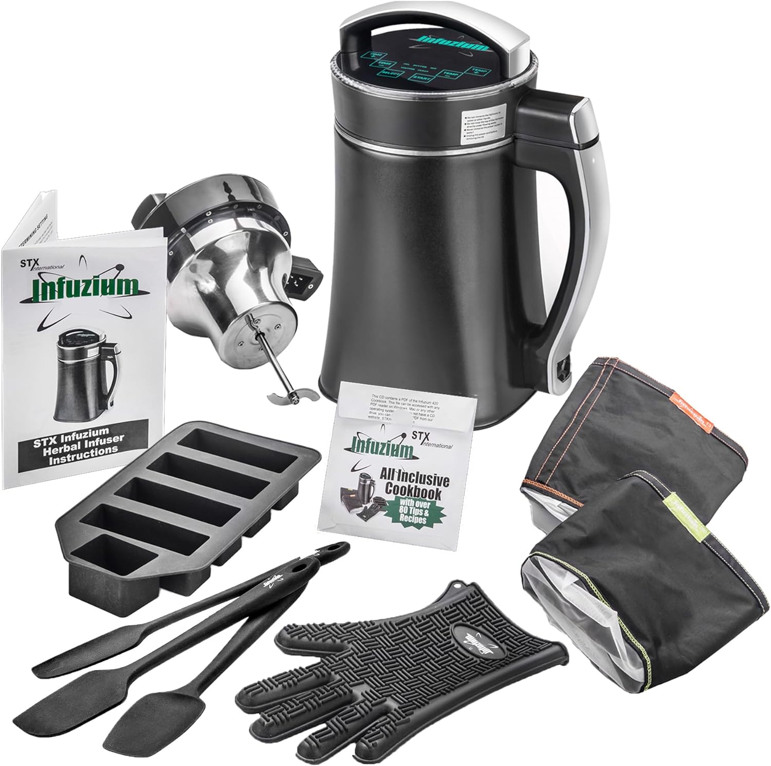 Fabricante de Infusores de Tintura de Aceite y Mantequilla Infuzium Kit Completo • 2-10 Palos de Mantequilla • 2 Filtros, 3 Espátulas de Silicona, Guante de Silicona y Molde de Mantequilla Además de nuestro Libro de Cocina Infuzium de 48 Páginas