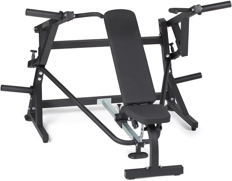 CHEST PRESS MACHINE: Plate-loaded chest press built for home and garage gyms. Includes a safety catch for solo workouts and delivers a free-weight style range of motion for a complete upper body press.
