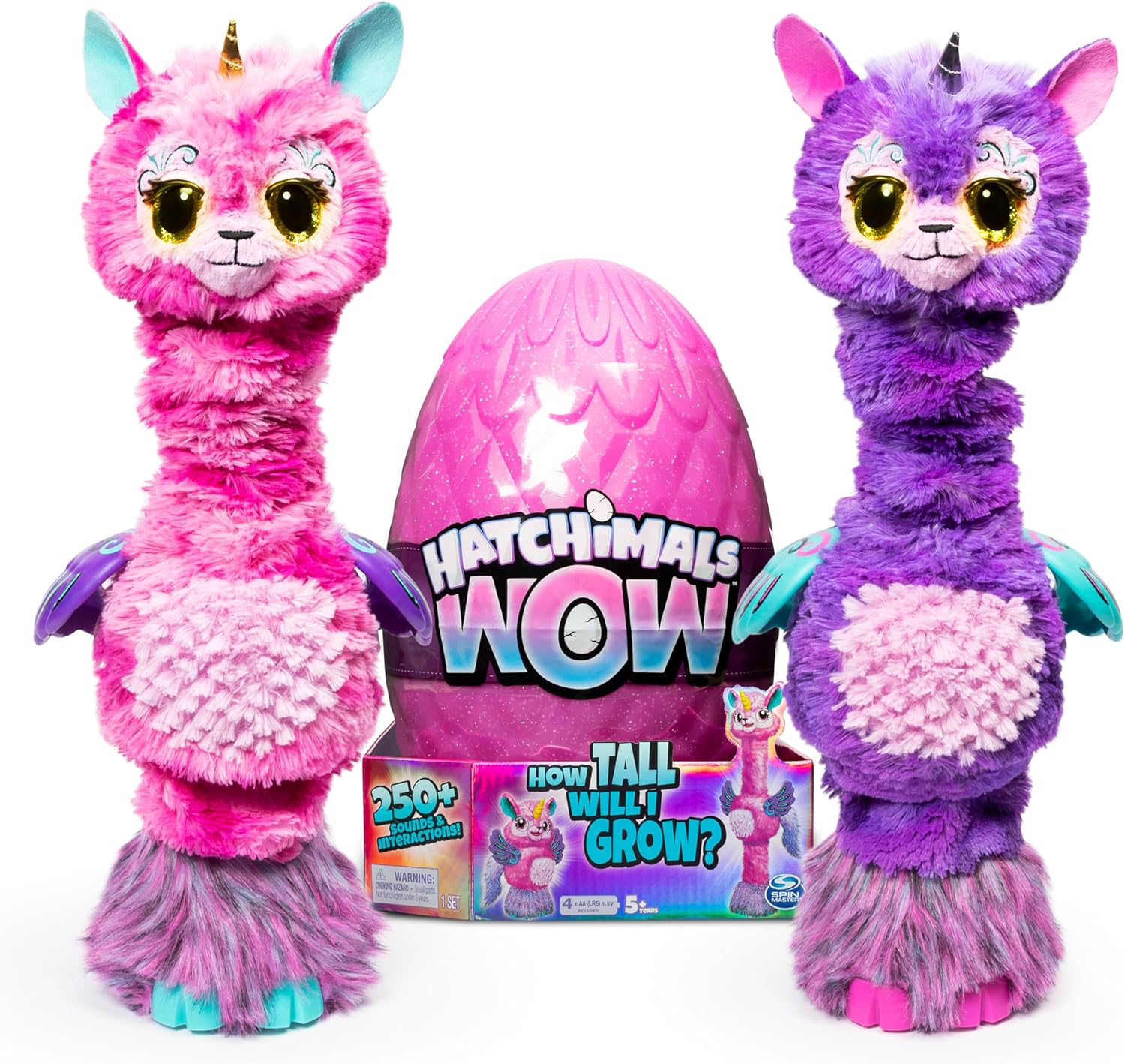 ¡Nunca antes habías nacido así! Presentamos la mayor sorpresa de Hatchimal hasta la fecha: ¡GUAU! Dentro del huevo de Hatchimal más grande y el primero que se puede volver a incubar, ¡hay un llalacorn deseoso de conocerte! Mitad unicornio y mitad llama, Hatchimals WOW es el primer Hatchimal que expresa sus emociones a través del movimiento. Con un cuello que puede crecer mágicamente hasta 32 pulgadas de alto o encogerse por sí solo, ¡el WOW de Hatchimals es más grande que la vida! ¡Cada vez que eclosionas el huevo, Llalacorn se despierta en una de las 10 formas sorpresa! ¡Fuera del huevo podrás abrazarla, darle de comer, jugar o hacerle cosquillas! La eclosión solo lleva cinco minutos, pero tu Llalacorn no puede hacerlo sin ti. Para incubar, inclina el huevo hacia adelante y hacia atrás. Cuando veas ojos de arcoíris a través de la cáscara, tu llalacorn está listo para salir del cascarón: crecerá más alto hasta que saque la parte superior del huevo y cante «Hatchy Birthday». Con una tela suave y esponjosa, un hocico afelpado y unos ojos expresivos, ¡no sabrás si te vas a quedar con un llalacorn rosado o morado hasta que nazca! Descubre la personalidad única de tu Hatchimals ¡WOW mientras juegas con ella! Si abraza a Llalacorn, se arrullará y encogerá hasta alcanzar un tamaño pequeño; pon música y crecerá más alta con la nota alta; haz que persiga su accesorio de confeti hacia arriba y hacia abajo; ¡y hazle cosquillas para que se ría y se mueva arriba y abajo! Cuando estés listo para otra eclosión, vuelve a colocar tus Hatchimals WOW dentro de su huevo para que eclosionen una y otra vez. Con más de 250 sonidos y reacciones, hay mucho por descubrir cuanto más juegues y cuides a tus Hatchimals ¡GUAU! Llévate a casa la sorpresa definitiva de Hatchimals con ¡WOW de Hatchimals!
