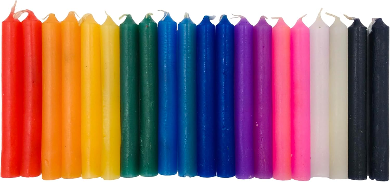 Set of 20 Colored Chime Candles: A complete pack with 2 candles each in white, black, red, orange, yellow, green, dark blue, light blue, purple, and pink. Whether you are decorating for a birthday dinner, marking an anniversary, or preparing for ritual work, you’ll have the right candle for every occasion.