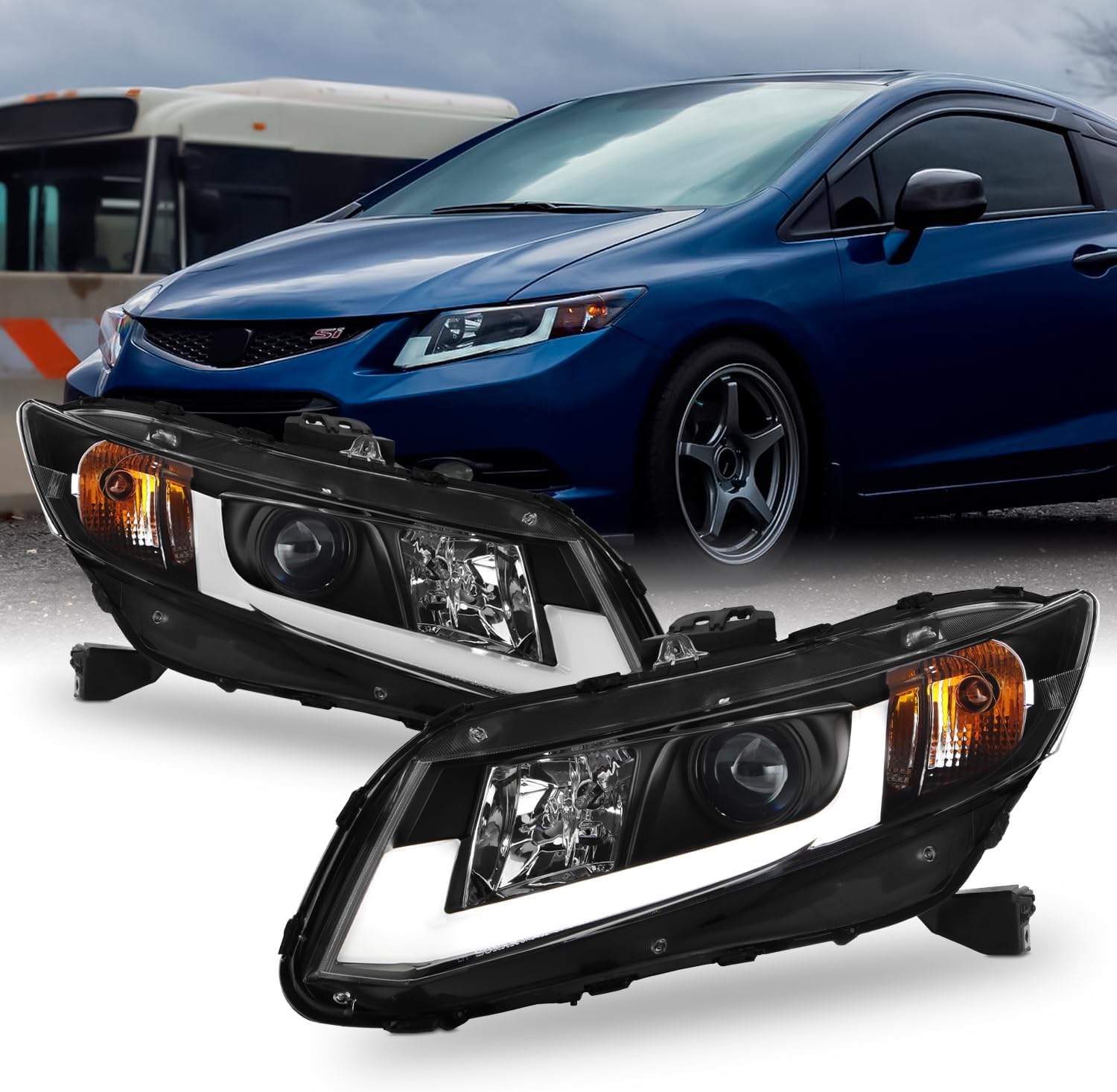 AKKON - For Honda Civic 4 Doors Sedan Black Bezel DRL Light Tube Projector Headlights Driver Passenger Lamps