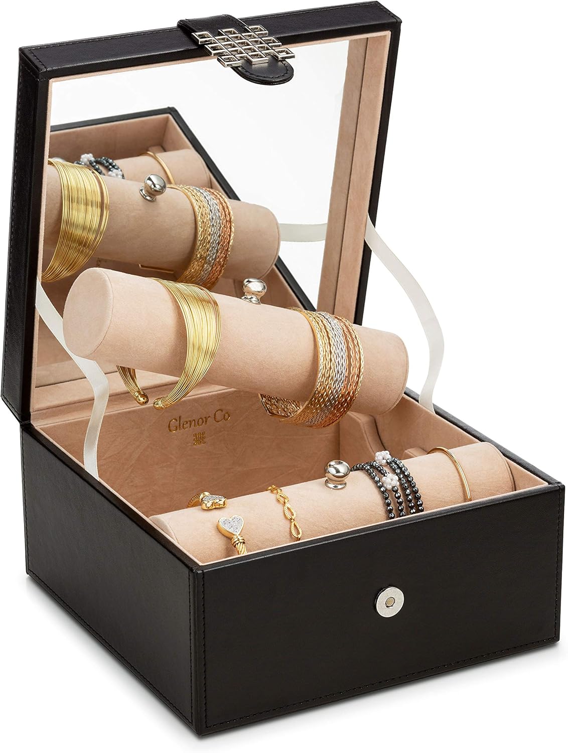 Glenor Co Bracelet Jewelry Box with 2 Removable Rolls - Holder stores Bracelets, Bangles & Watches – Organizer w Modern Metal Closure - Large Mirror – PU Leather - Display on Stand or Dresser - Black