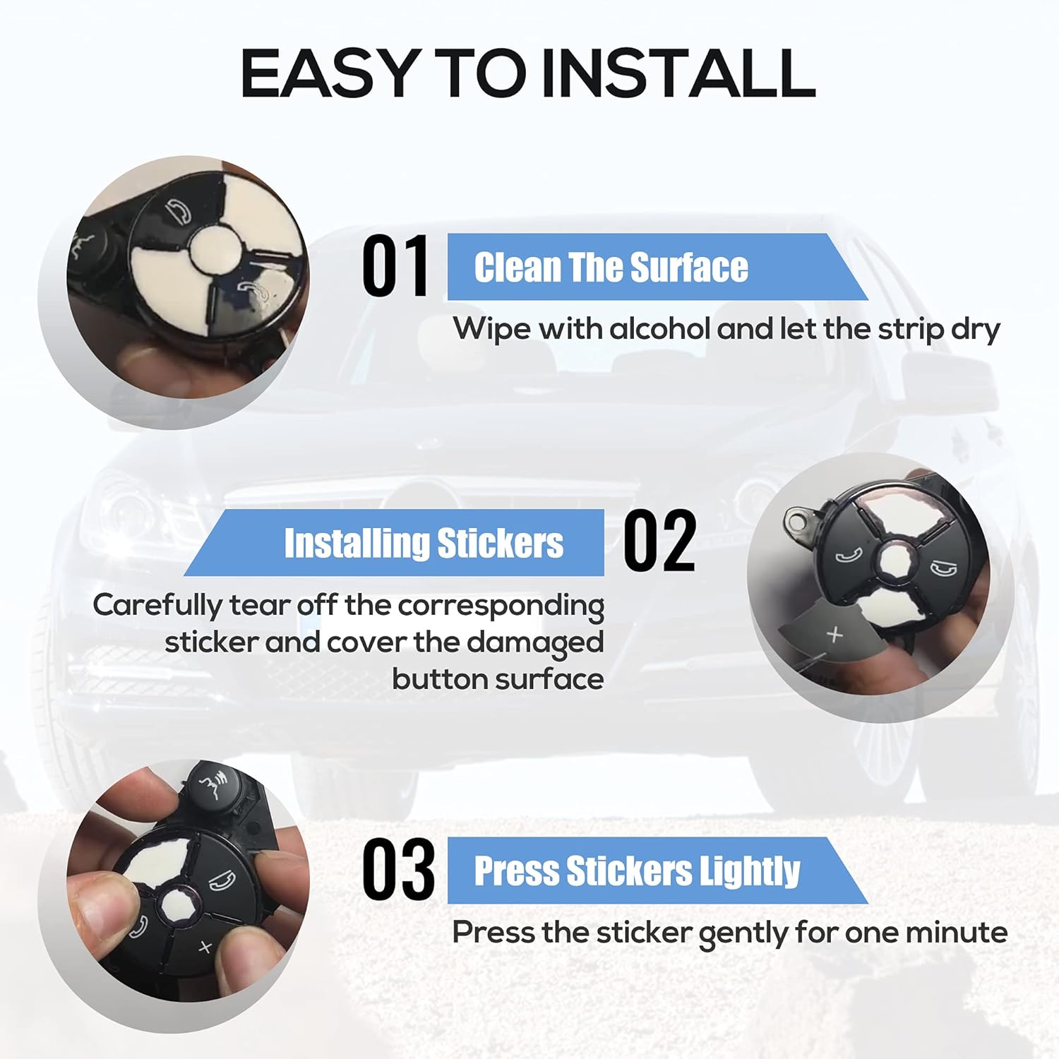 Easy to use: tear off the sticker on the back and stick it on the botton which need to be repaired. Keeping the bottons clean and dry before sticking
