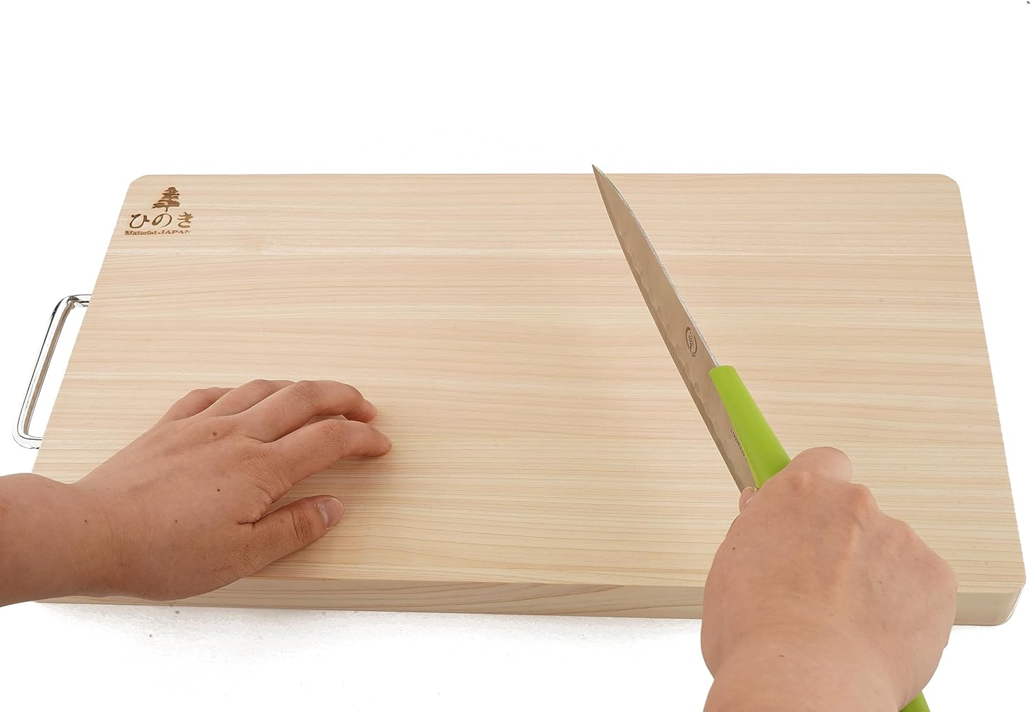 [Comfort] Soft grain of hinoki wood make it a cutting that won’t dull your knives, and you can handle it easily because it has a metal handle.