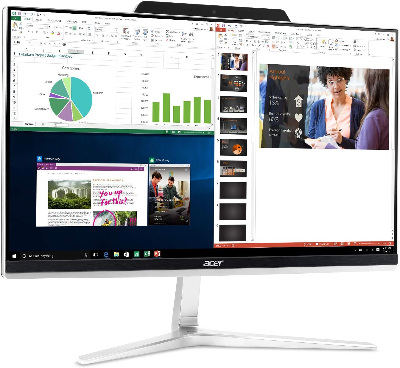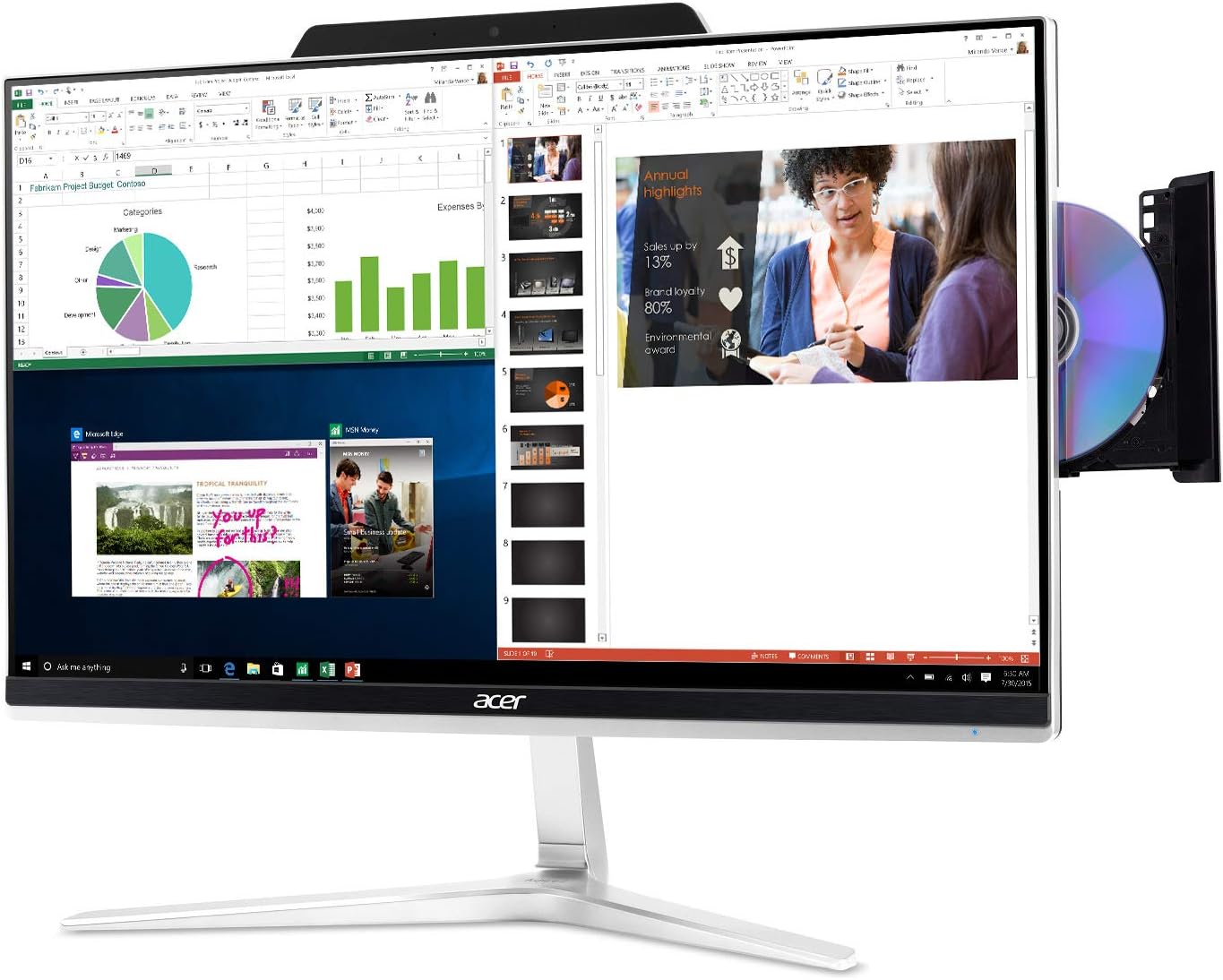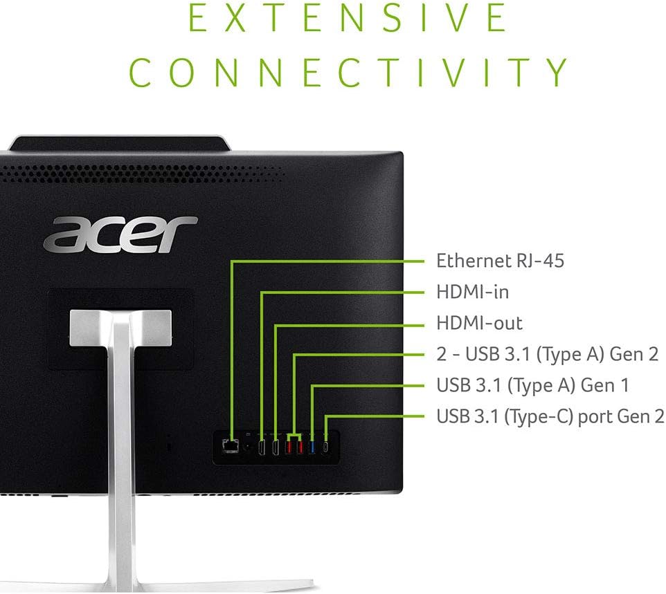 La computadora de escritorio todo en uno Acer Aspire Z24 890 UA91 viene con estas especificaciones: procesador Intel Core i5 9400T de novena generación a 1,8 GHz con tecnología Turbo Boost hasta 3,4 GHz, Windows 10 Home, pantalla panorámica Full HD de 23,8" con retroiluminación LED de borde a borde, memoria DDR4 de 12 GB, gráficos Intel UHD 630, SSD de 512 GB, integrado de 2.0 MP Cámara web HD (1080P) y micrófonos digitales duales integrados, 10/100/1000 Gigabit Ethernet, Wi-Fi 802.11ac, Bluetooth 4.2 LE, mejora de sonido Dolby Audio Premium optimizada, tecnología Acer TrueHarmony, dos altavoces estéreo integrados de 2 W, 1 puerto USB 3.1 (tipo C) (Gen 2 hasta 10 Gbps), 2 puertos USB 3.1 (tipo A) Gen 2, 1 Puerto USB 3.1 (tipo A) Gen 1, 1 puerto USB 2.0 (inferior, utilizado para llave RF), 1 puerto de entrada HDMI (posterior), 1 puerto de salida HDMI (posterior), 1 puerto Ethernet RJ 45 (posterior), teclado y ratón inalámbricos, 15,43 libras | 6,99 kg (solo unidad del sistema), 1 año de garantía limitada para piezas y mano de obra con soporte técnico gratuito (DQ.BEDAA.001), ddr4_ sdram, todo en uno, fácil de usar. Potencia máxima de la fuente de alimentación: 65 W