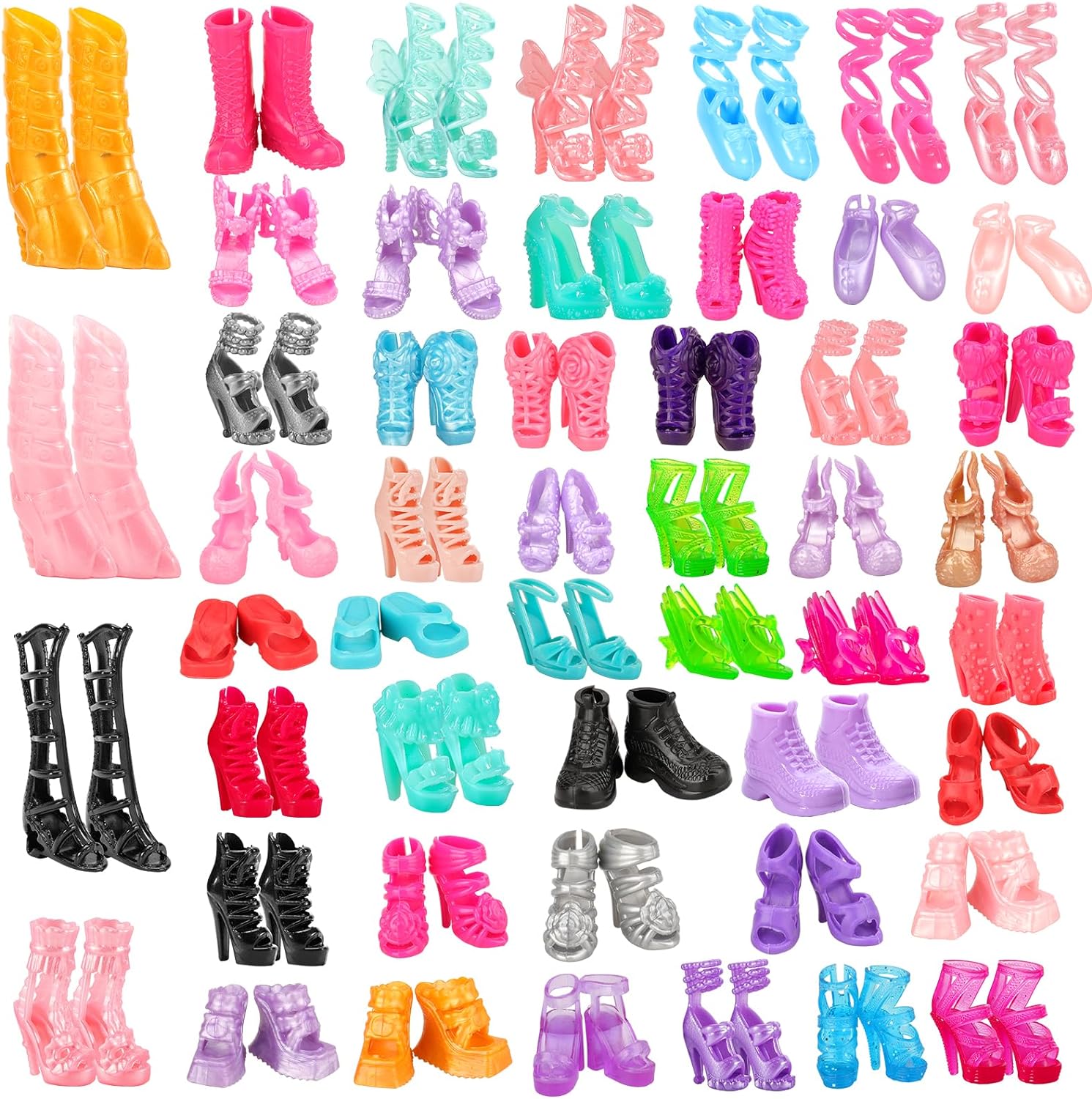 ¿Qué hay en la caja? 50 pares de zapatos de tacón y plano para muñecas (Estilo Aleatorio) No se ajustan a todas las muñecas.