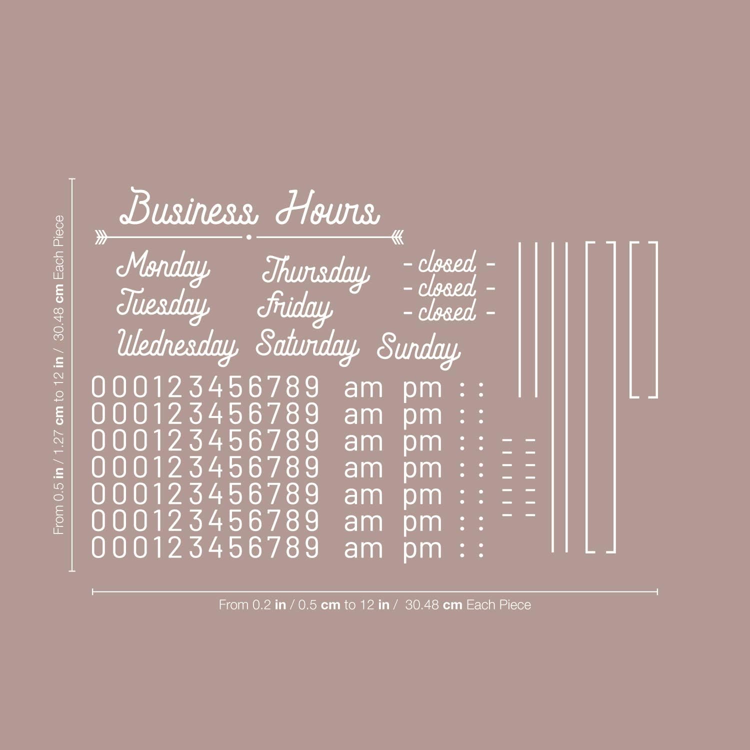 ✓ Our high quality professional vinyl "Business Hours" cursive font adhesive design range from 0.5 inches to 12 inches. The pictures are for display and inspiration only. All of our vinyl wall decals are manufactured with premium industrial grade Lutema self-adhesive vinyls.