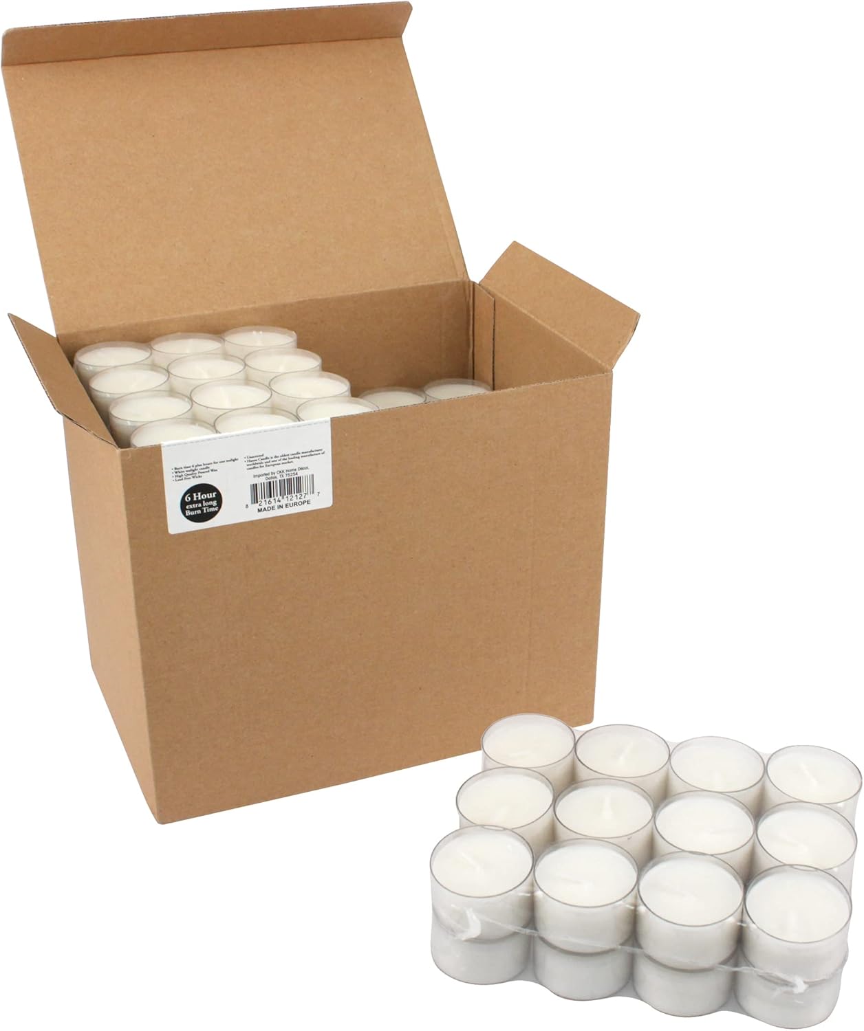 48 unscented long burning clear cup tea light candles come neatly and tightly shrink-wrapped and packaged in a protective storage box