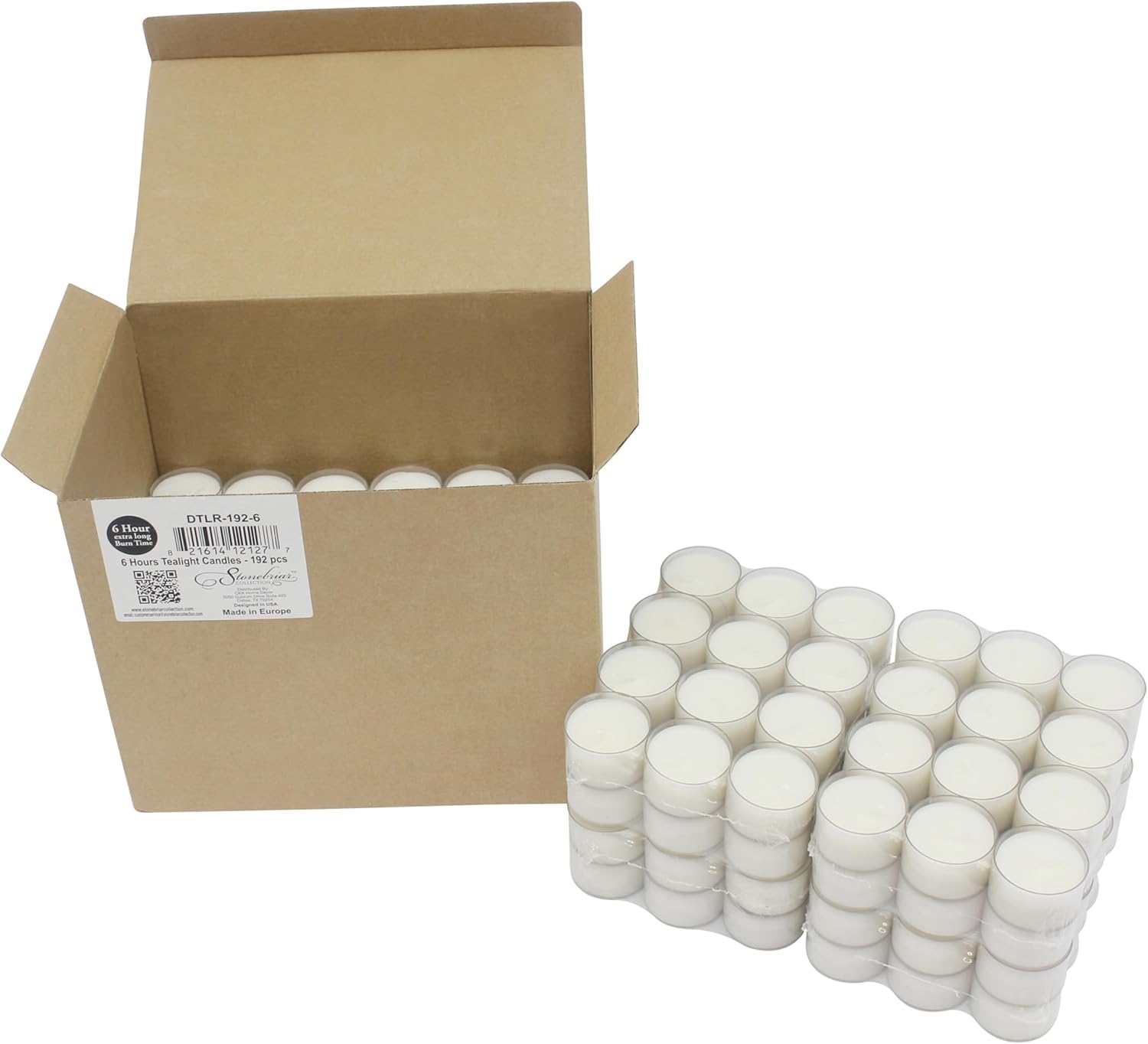 Stonebriar’s long lasting tea light candles are hand poured with quality sustainable palm wax in Europe for an extended 6-7 hour burn time
