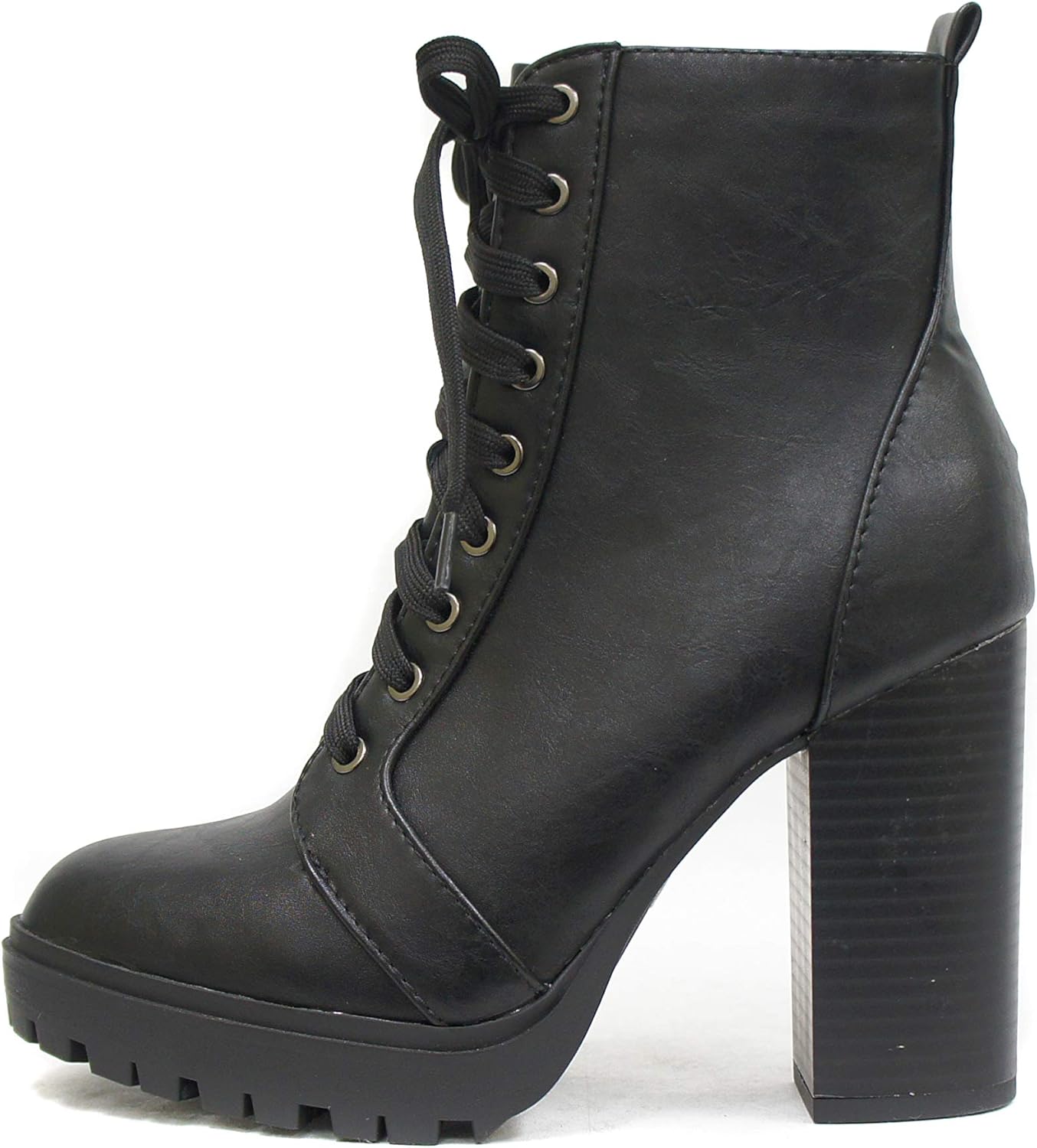 Soda Latest Collection “Balboa” This military inspired combat bootie features a chunky block high heel, faux wood stacked heel with threaded lug sole, full front lace up, side zipper closure for easy access. It has around 5 inches shaft height with rounded toe, antique metal eyelets, and flatted stiff laces. It’s comfortable and casual, suitable for everyday use, school, shopping, walking etc