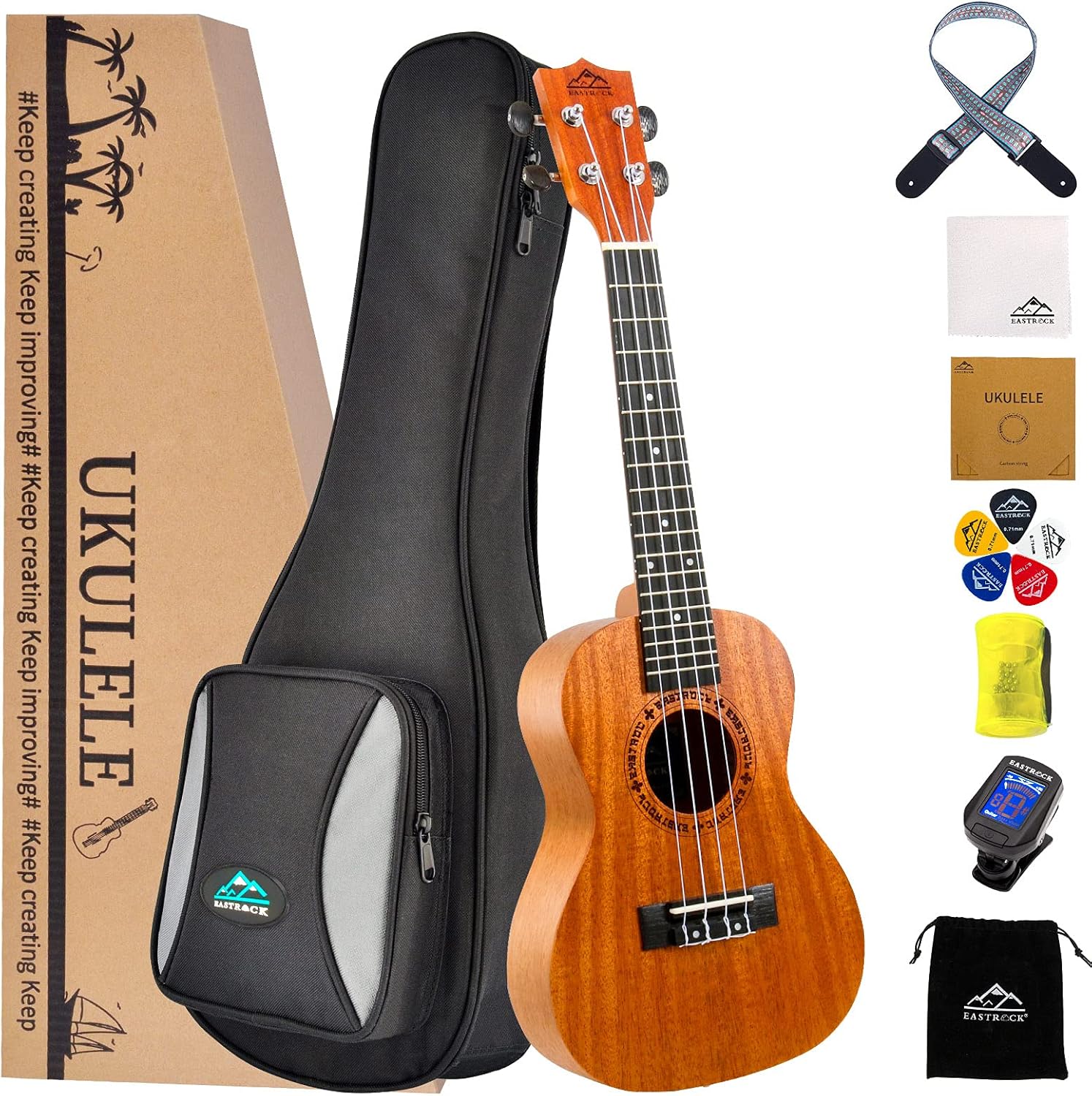ALL-in-one set: Pre-tuned before shipping to help ensure the strings stretch out properly and stay in tune better upon arrival. EASTROCK Ukelele set includes a 23" Concert Uklele,1*Ukalele Padded backpack gig bag which Fits all standard size Ukuleles. Outside pocket can hold tiny stuff like string set, picks, paper ext. 5*Ukele picks,1 set* String,1*Tuner,1*Microfiber polishing cloth,1 Flannel bag,1*Sand Hammer (Concert Ukalalee,Ukelele)
