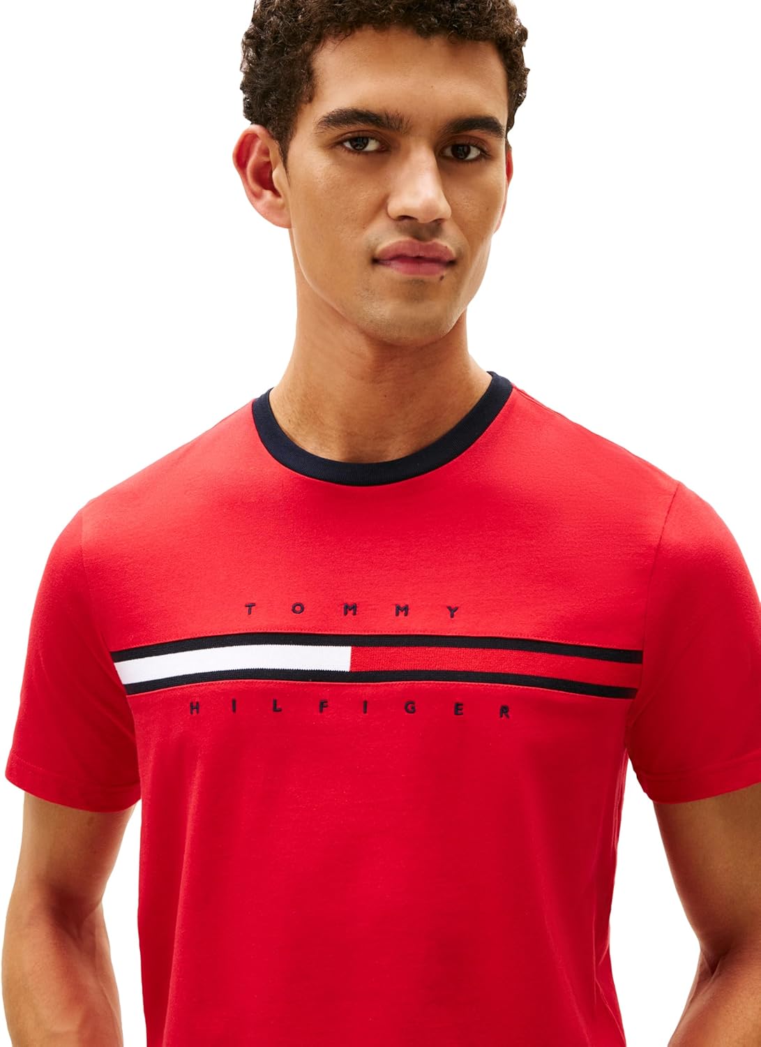 All year, keep it clean and classic with this tee from Tommy Hilfiger. T shirt for men with crew neck collar design. Men's t shirt with embroidered flag logo at sleeve. Tommy Tee with a graphic design on front. Short sleeve tee in soft cotton material.
