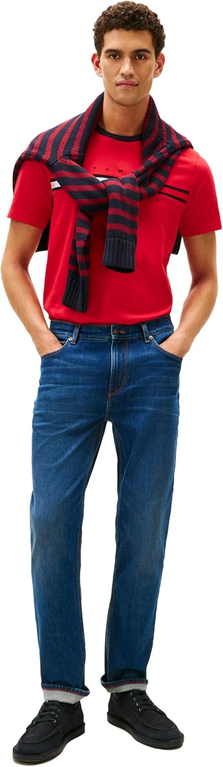 All year, keep it clean and classic with this tee from Tommy Hilfiger. T shirt for men with crew neck collar design. Men's t shirt with embroidered flag logo at sleeve. Tommy Tee with a graphic design on front. Short sleeve tee in soft cotton material.