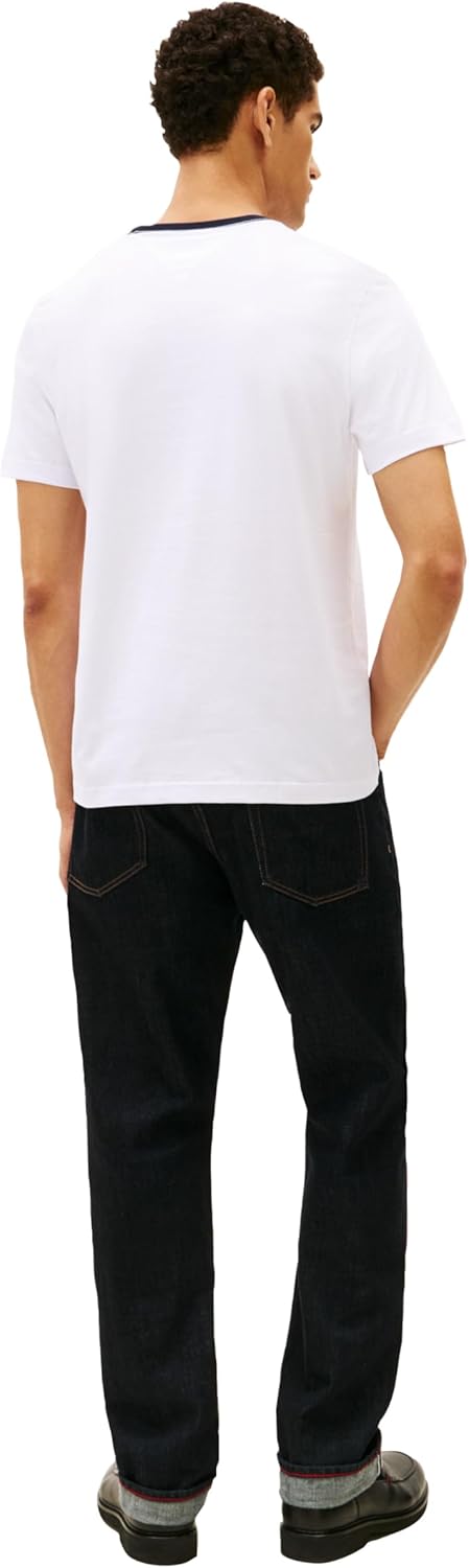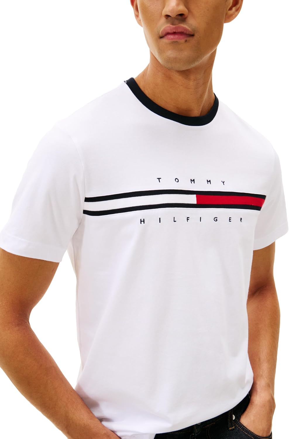 Todo el año, mantenlo limpio y clásico con esta camiseta de Tommy Hilfiger. Camiseta para hombre con diseño de cuello redondo. Camiseta de hombre con logo de bandera bordado en la manga. Camiseta Tommy con diseño gráfico en el frente. Camiseta de manga corta en suave material de algodón.