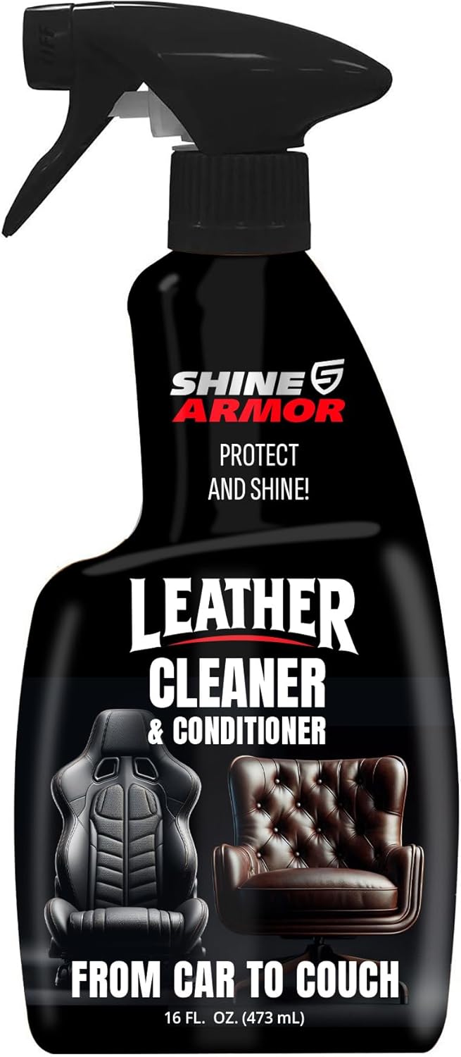 This Leather Cleaner and Conditioner by Shine Armor will rejuvenate your leather interior, couch, and accessories. Enjoy the natural look and soft, new leather feel with our effective, easy-to-use cleaner and conditioner. Colorless and odorless, this 2 in 1 formula leather cleaner will make your worn leather gorgeous again. Easy & Convenient Cleaning and conditioning is very important if you want to enjoy your leather for a long time, neglecting your leather can result in aged, dried, and cracked leather. With our Leather Cleaner and Conditioner you can easily and effortlessly have your leather looking stunning again in no time. Just one easy application of Shine Armor Leather Cleaner & Conditioner and your set! Don't mess around with cleaner and conditioner, we've got you covered in just one step. Use Shine Armor Leather Cleaner & Conditioner On All Your Leather You can use this effective 2 in 1 cleaner on all your leather, from your car interior, to your leather couch, to your jackets, boots, and other accessories. Keep your favorite leather boots and shoes looking new, with this cleaner and conditioner that penetrates deep into the fibers of your leather to moisturize, soften, and restore. Give new life to your expensive bags or purses and enjoy them for years to come. Our Leather Cleaner & Conditioner is non-toxic, designed to moisturize leather making it pliable and supple once again, and protecting it from aging. Don't let your leather dry out, give it the hydration it needs to stay beautiful. Our 2 in 1 cleaner + conditioner will protect your new leather and bring your old leather back to life. Treat your leather every 6 months for best results.