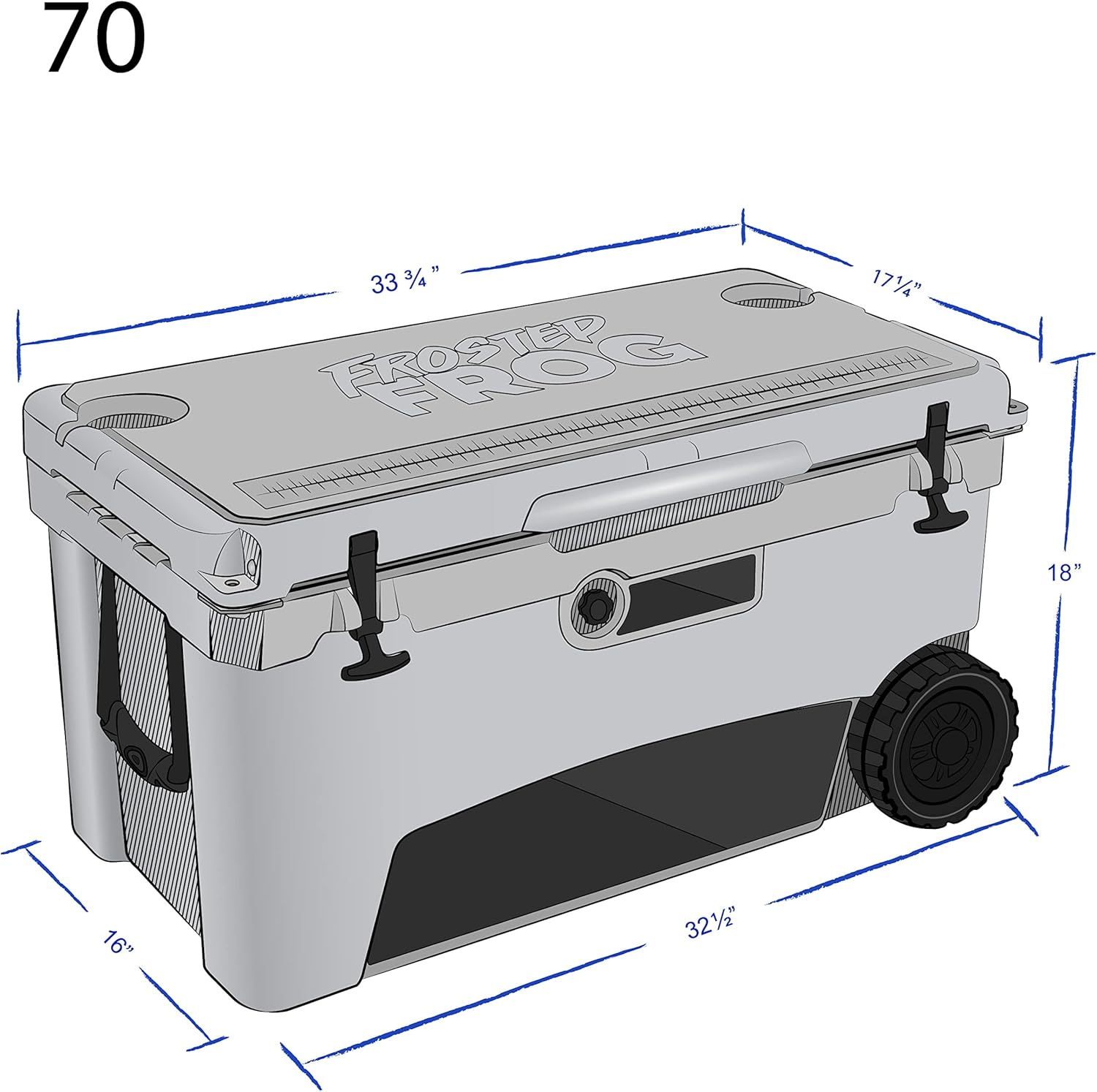 Frosted Frog 70qt cooler is high quality rotomolded with extra-thick walls for superior insulation. Manufactured with high density multi compound PU Foam and an environmentally friendly pressure-injected insulation system. Heavy duty rubber latches and non-slip, non-marking bottoms on all four corners. Commercial grade door lid seal gasket. All materials used are non-toxic.