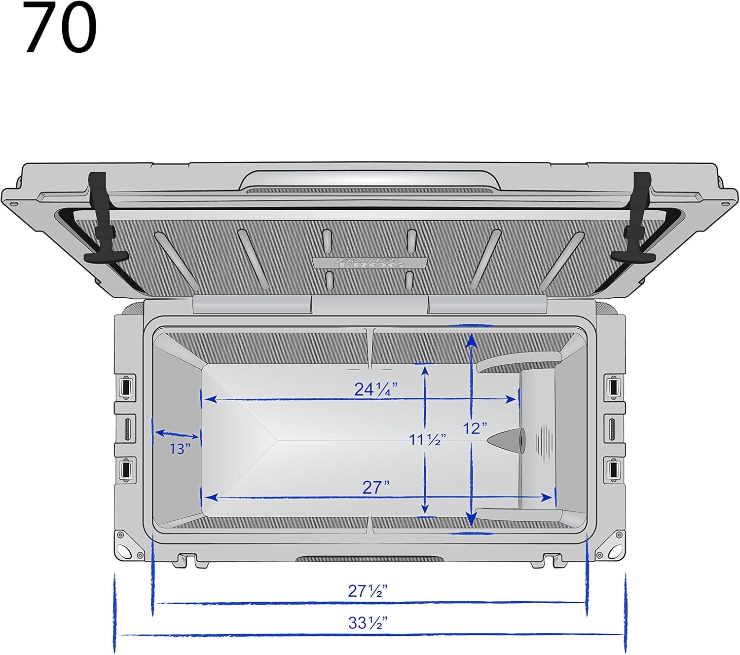 HEAVY DUTY INSULATION: 70 Quart Ice Chest holds ice for days on end with inches of commercial grade insulation, Freezer Style lid gasket, and Rubber Cold Seal Latches