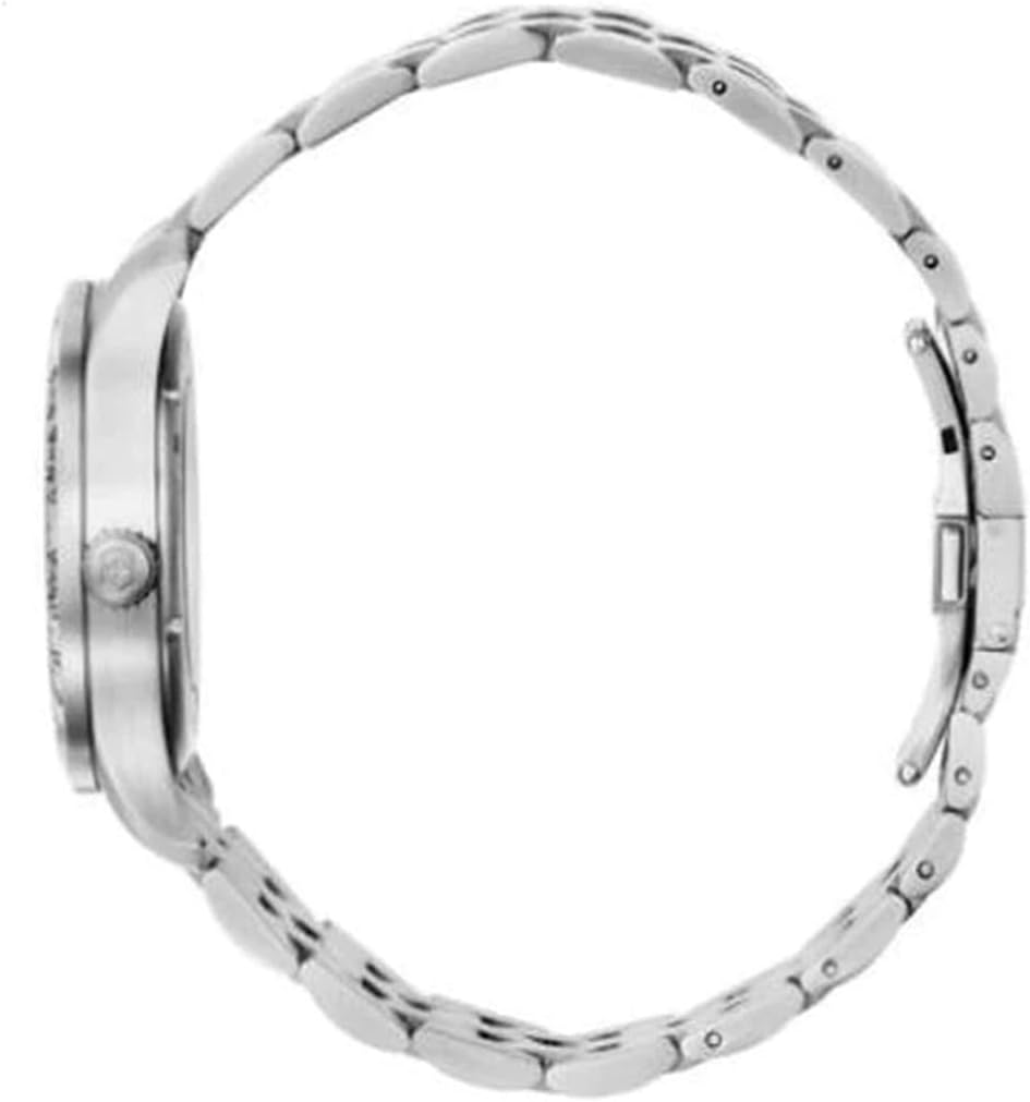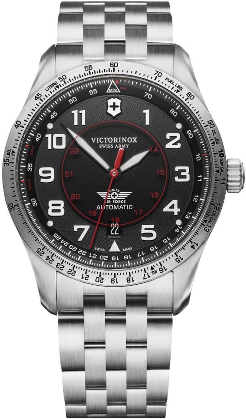Black dial enhanced by luminous black hands. Silver-tone stainless steel case with a silver-tone stainless steel band. Automatic movement. 100 meters / 330 feet water resistance. Bi-directional Rotating bezel. Scratch Resistant Sapphire crystal. Transparent caseback. Deployment clasp. Case size 42 mm x 11 mm. Band 22 mm x long. Victorinox 241888 Airboss Watch.
