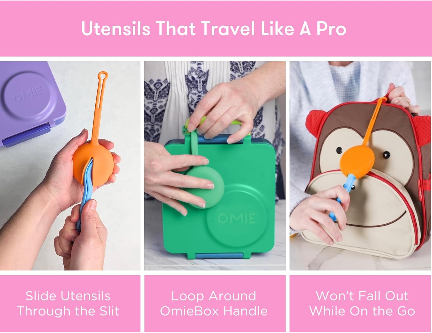LLÉVALO A DONDE QUIERAS - Utensilios pequeños, ligeros y portátiles que se pueden sujetar a cualquier cosa. Los utensilios se mantienen firmemente en el cubo y no se caerán. Revisa nuestras otras publicaciones para comprar juegos de utensilios adicionales o la caja bento OmieBox.