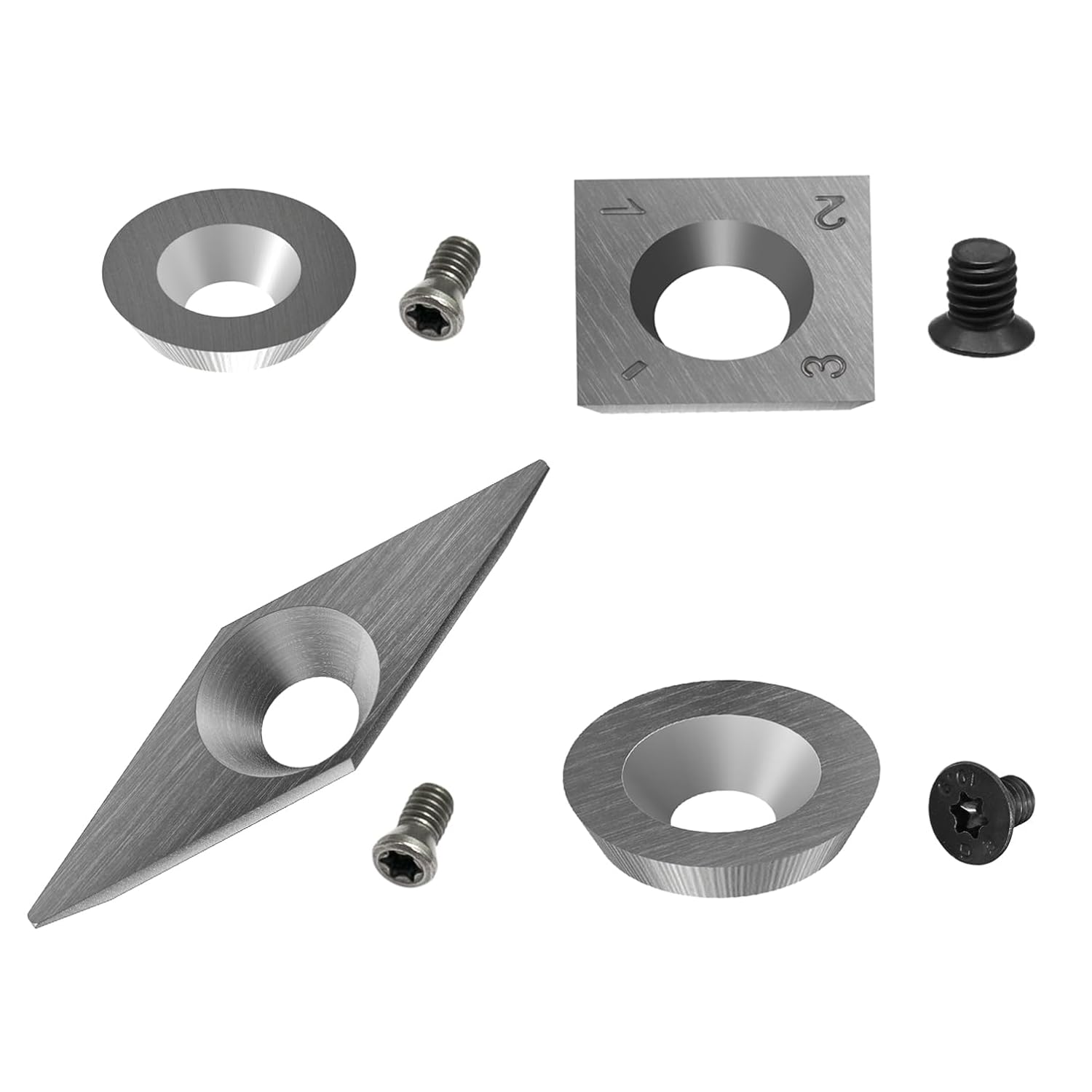 4pcs Carbide Turning Inserts Cutters Set for Indexable Lathe Turning Tool Holder Insert Replacement of Round 16mm 12mm, Square 14mm, Diamond 28mm, Fit for AT04 Woodturning Tool Set