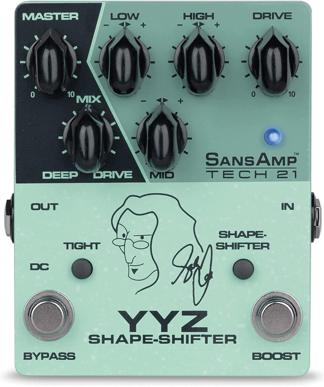YYZ SHAPE-SHIFTER FEATURES All analog SansAmp technology enables you to record directly and enhance previously recorded tracks. For live performances, the YYZ Shape-shifter can drive a power amp and speakers, augment your existing amplifier set-up, or run directly into the mixer of a PA system Mix control to blend the ratio of high-end studio clean (Deep) and dirty bass tube amp tones (Drive. Tight button to add definition to your notes in cleaner settings and make distorted tones snappier Boost / Shape-shifter selectable Boost function deviates from the norm. It provides a 12dB presence boost for increased top-end distortion. Kick in the Shape-shifter button, and get 6dB of Schmegilka on top, which, according to Geddy “is an indefinable thing of awesomeness!” Drive adjusts the overall amount of gain and overdrive, similar to when the output section of a tube amp is being pushed Active 3-band EQ. Master volume Operable with 9V alkaline battery (not included) or optional DC power supply, Tech 21 model #DC9 (or former models #DC2 or #DC4) Sample settings in the owner’s manual include: Geddy’s Personal Setting YYZ Rickenbacker Shape-shifter Camera Eye Red Barchetta Warm Tube/Studio Bi-amped Overdrive