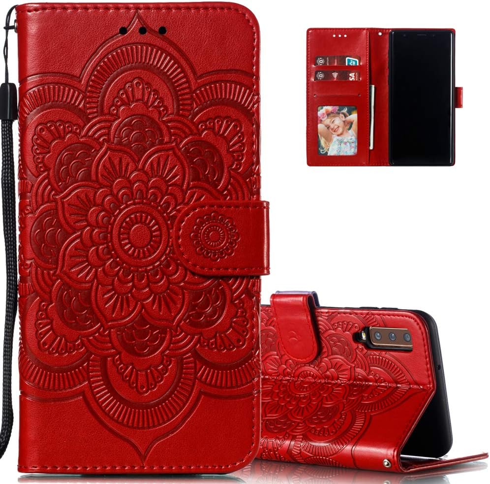 LEECOCO for Samsung A7 2018 Case Embossing Luxury PU Leather Flip Notebook Wallet Bookstyle Magnetic Stand Card Slot Folio Bumper Protection Cover for Samsung Galaxy A7 2018 / A750 Mandala Red LD