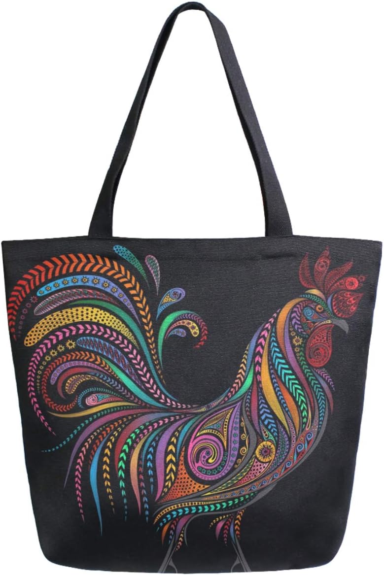 Chic Extra Large Shoulder Grocery Tote Bag, Beautiful Colorful Cock Rooster Print Canvas Reusable Handle Bags for Men Women Gym Weekender Picnic Beach Travel Home Storage Market Shopping