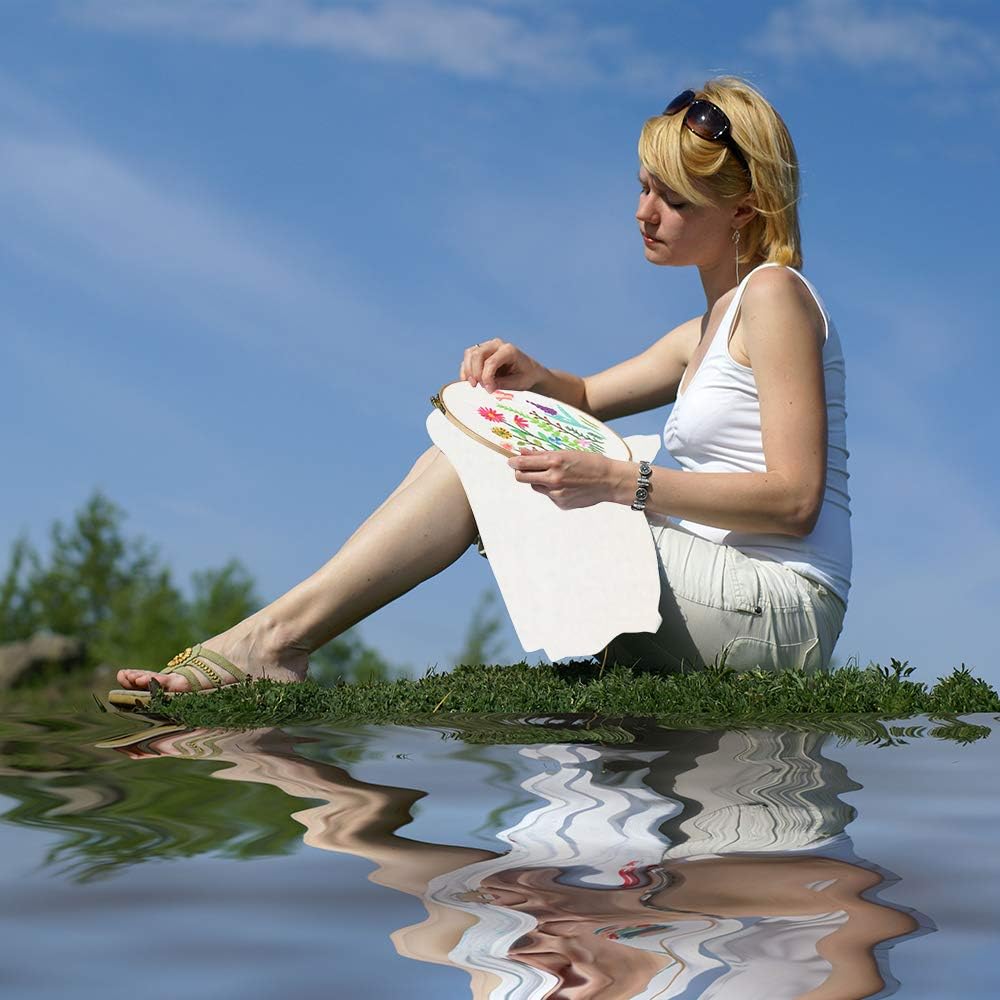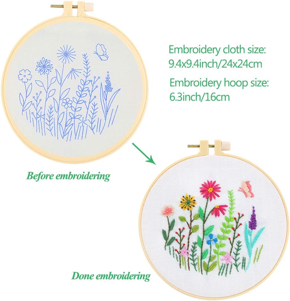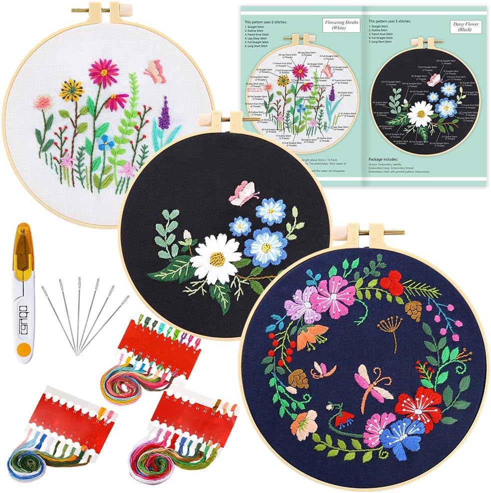Paquete de Valor: 1 tela de algodón blanca con patrón de Arbustos en Floración, 1 tela de algodón negra con patrón de Margarita, 1 tela de algodón azul con patrón de Jardín Botánico, 2 marcos de bordado de 6.3 pulgadas, 1 marco de bordado de 7.9 pulgadas, 3 juegos de hilos de bordado suaves, 6 agujas de bordado, 1 tijera, 1 instrucciones
