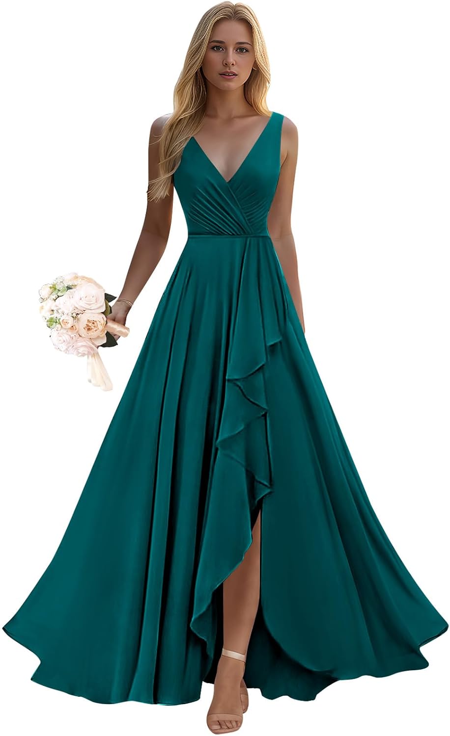 Vestido de dama de honor Vici Gowner para mujer con cuello en V, largo para boda, vestido formal de noche plisado de chifón con abertura