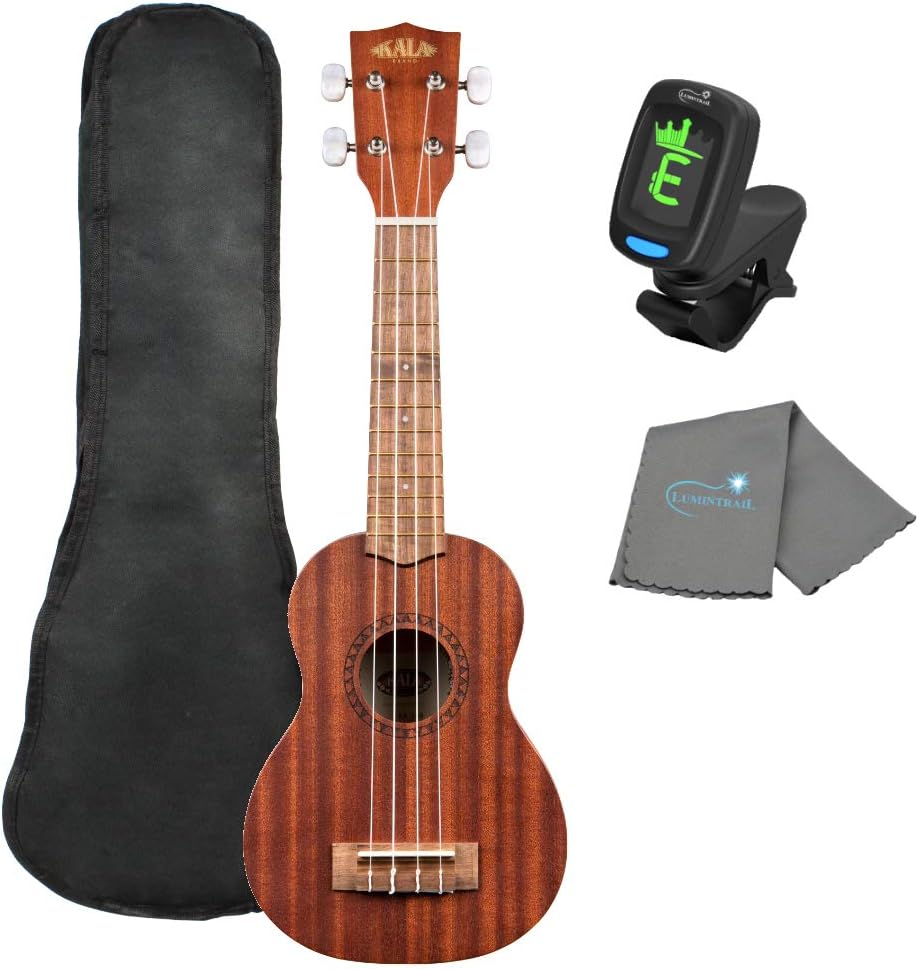 Kala KA-15S Ukulele Satin Mahogany Soprano Bundle with a Ukulele Tote Bag, Tuner, and Lumintrail Polishing Cloth